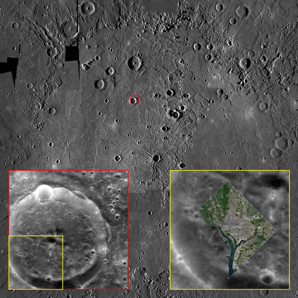 It is therefore quite possible to lose sight, despite its small size, of just how big many features on Mercury are. This image shows a photomosaic of the mighty Caloris basin, with a much smaller, unnamed crater in its northwestern quadrant highlighted with a small red box. The bottom left inset, outlined in red, shows a NAC high-resolution image of this same crater -- and the bottom right inset, outlined in yellow, shows how the entirety of Washington, D.C. fits comfortably into the area between that crater's central peak and its rim! The District of Columbia forms a partial diamond that is 16 km (10 mi.) on a side, or approx. 22 km (14 mi.) from north to south, and is home to over 600,000 people. In fact, Caloris is so big that the entire state of Texas could fit within its perimeter.