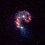 This false-color image from NASA's Spitzer Space Telescope reveals hidden populations of newborn stars at the heart of the colliding "Antennae" galaxies. These two galaxies, known individually as NGC 4038 and 4039, are located around 68 million light-years away and have been merging together for about the last 800 million years. The latest Spitzer observations provide a snapshot of the tremendous burst of star formation triggered in the process of this collision, particularly at the site where the two galaxies overlap.