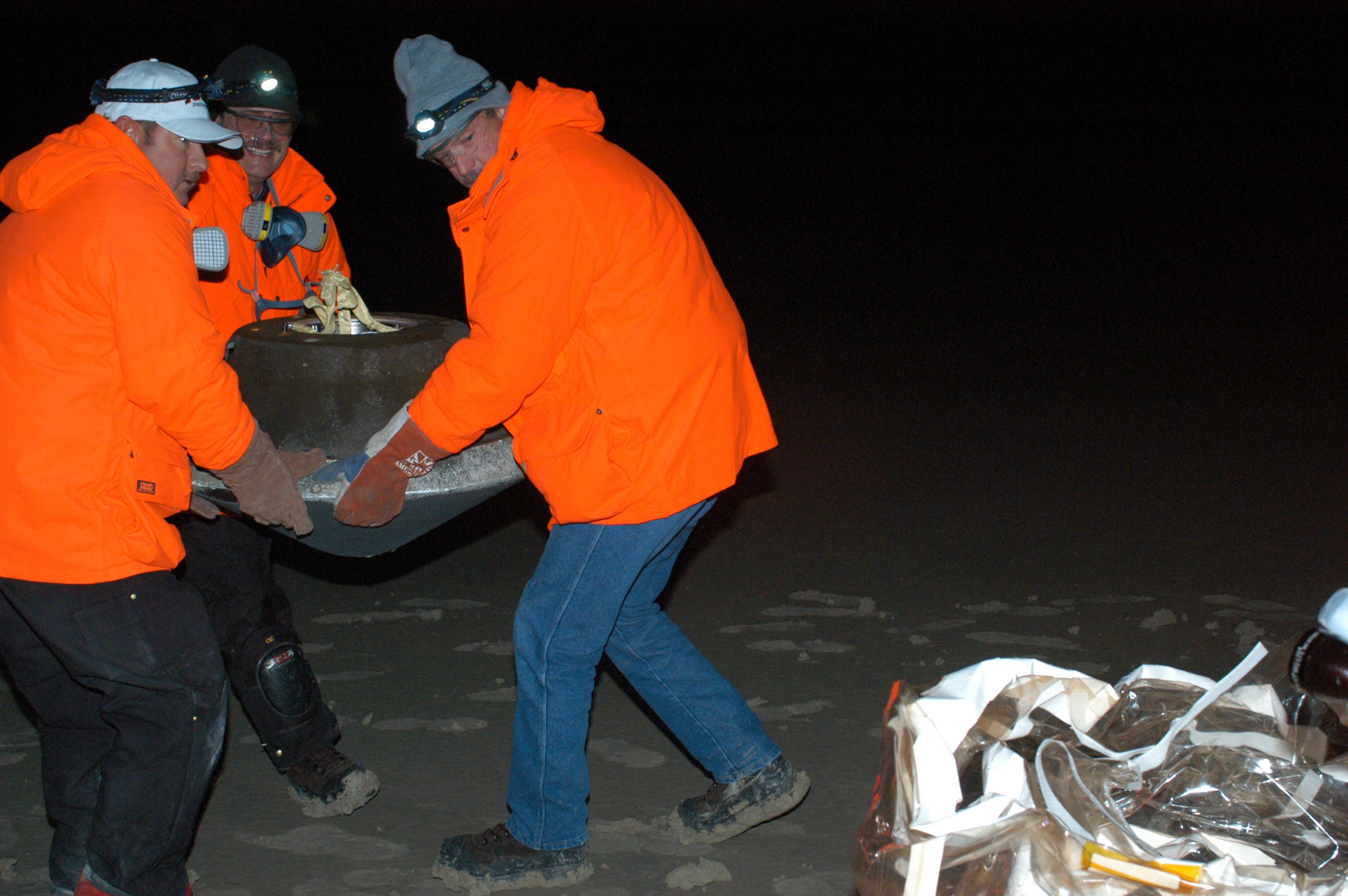 Here, the capsule is being lifted at the landing site.