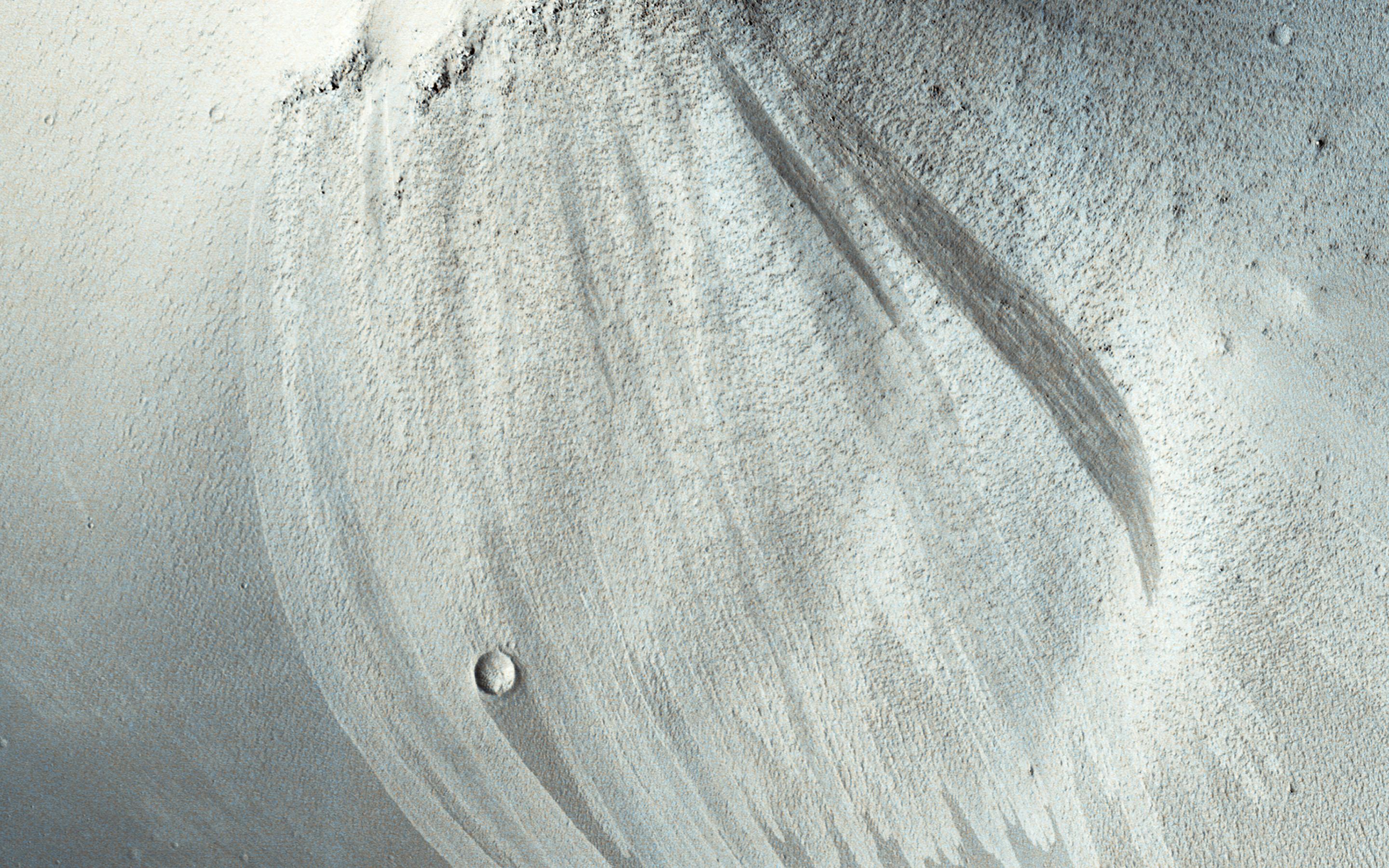 Slope streaks are common in the tropics of Mars. Once thought to be caused by flowing water, most scientists now believe that they are avalanches of dust. They are typically darker than their surroundings and often fan outwards downslope. This suggests that the dust sediment is sticky, so that the avalanche broadens as it flows downhill.