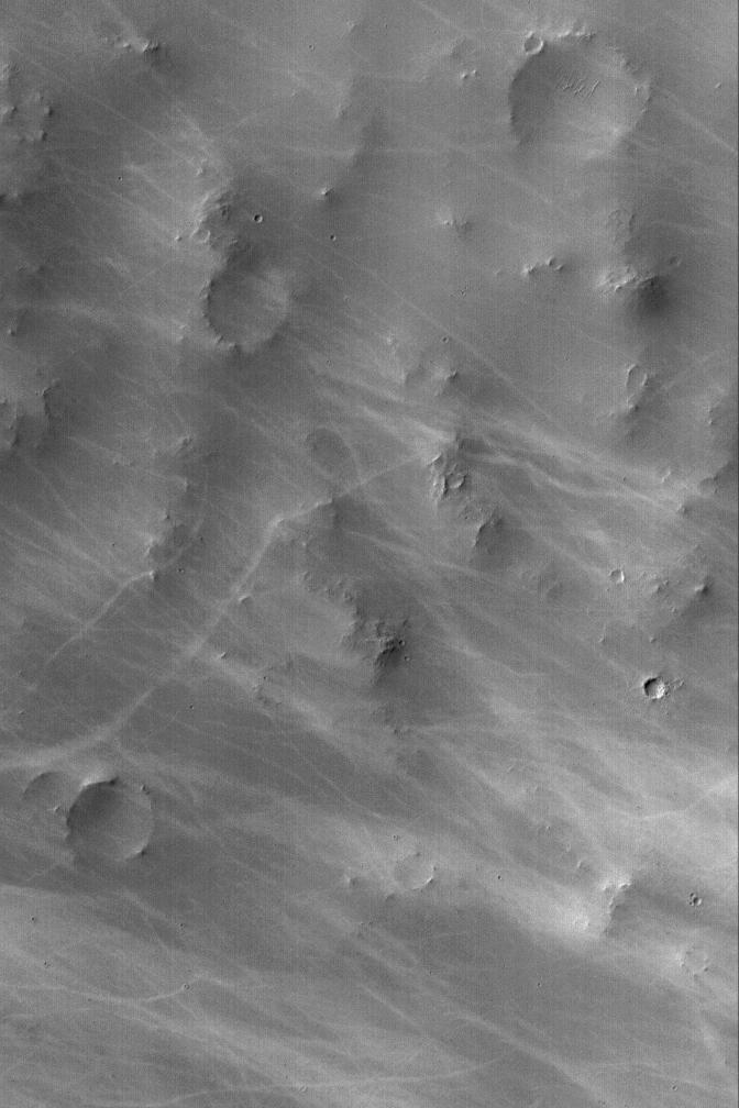 Many Mars Global Surveyor (MGS) Mars Orbiter Camera (MOC) images exhibit wild patterns of dark streaks thought to have formed by the passage of many dust devils. The dust devils disrupt the dust coating the martian surface, leaving behind a streak. However, not all dust devils make streaks, and not all dust devil streaks are dark. Some are light---it simply depends upon which is darker, the substrate or the dust that the spinning vortex disrupts. The example of light-toned dust devil streaks shown here is located in southern Schiaparelli Basin near 5.3°S, 343.3°W. The image covers an area about 3 km (1.9 mi) across; sunlight illuminates the scene from the left/upper left.