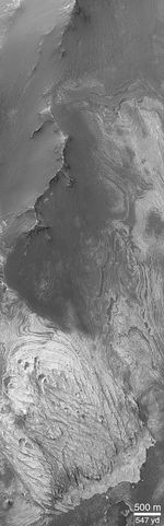 Valles Marineris a system of troughs, chasms, and pit chains that stretches more than 4,000 km (2,500 miles) across the martian western hemisphere. Outcrops of layered material found in mounds and mesas within the chasms of the Valles Marineris were known from the pictures taken by Mariner 9 in 1972 and the Viking orbiters of 1976-1980. One example of the those known previously is the mesa labeled "Candor Mensa" in the context image (above); another example is the mound in the center of Ganges Chasma. For several decades, it has been widely speculated among Mars scientists that the light- and dark-toned layered materials in the Valles Marineris might have formed in lakes that had once filled the chasms during the most recent epoch of martian history; others thought they might result from volcanic ash deposited in the chasms. Mars Global Surveyor (MGS) Mars Orbiter Camera (MOC) images have confirmed the presence of light- and dark-toned layered sedimentary rock outcrops in the Valles Marineris, but they have also revealed many more than were previously known and they have shown several good examples that these materials are coming out of the walls of the Valles Marineris chasms. The fact that these materials come out of the chasm walls means that the layers do not represent lakes (or volcanic debris) that formed in the Valles Marineris. Instead, they represent materials deposited and buried long before there ever was a Valles Marineris. They are seen now because of the faulting and erosion that opened up and widened the Valles Marineris troughs. The context image is a mosaic of Viking 1 orbiter images taken in 1976 showing a portion of the wall that separates western Ophir Chasma from western Candor Chasma in the Valles Marineris. This area is located around 5°S, 74°W. The white box labeled "M17-00467" shows the location of a subframe of MOC image M17-00467 that was acquired in July 2000 to allow scientists to examine one of the many bright patches (indicated by small arrows) seen on the walls of Valles Marineris. The release image is a subframe of MOC image M17-00467, showing a high-resolution view of one of the bright patches on the walls of Candor Chasma. The MOC image reveals that the bright material indeed consists of light-toned layered rock similar to other outcrops thought to be sedimentary in origin found throughout the Valles Marineris. The dark ridge running from top center to center-left in this view is mantled by a smooth, dark material that covers additional light-toned layered rock. The observation that these kinds of bright layered rock occur within the walls of the Valles Marineris indicate that the materials are very, very old. They have been buried under several kilometers (i.e., more than a mile) of additional layered rock, all of which is beneath plains thought to be more than 2.5 to 3.5 billion years old. These relationships suggest that all of the layered sedimentary rocks observed on Mars by MGS MOC may date back to the earliest parts of martian history, between 3.5 and 4.5 billion years ago. In both pictures, north is toward the top. Sunlight illuminates the context image from the top/right; the MOC image (top left) is illuminated from the upper left.