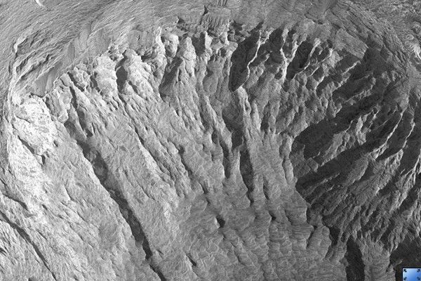 In this image, some layers can be seen, but much of the surface has a strange scalloped texture. The cause of this texture is unclear, but it is likely related to the mechanism of erosion of these deposits as well as their physical nature.