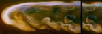 The white arrow in the annotated version of this panel points to the location where the lightning occurred in the clouds. The optical energy of this and other flashes on Saturn is comparable to the strongest of the flashes on Earth. The flash is approximately 120 miles (200 kilometers) in diameter when it exits the tops of the clouds. From this, scientists deduce that the lightning bolts originate in the clouds deeper down in Saturn's atmosphere where water droplets freeze. This is analogous to where lightning is created on Earth.