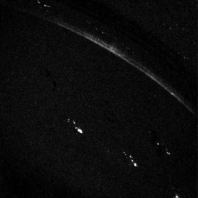 LIGHTS IN THE NIGHT ON JUPITER: This Voyager 1 image was taken of Jupiter's darkside on March 5, 1979. The picture is a 3 minute, 12 second exposure by the wide angle camera taken when the spacecraft was in Jupiter's shadow, about 6 hours after closest approach to the planet at a distance of 320,000 miles. Jupiter's north pole is on the limb toward the upper center. The long bright double streak is an aurora on Jupiter's limb near its north pole. The other bright spots probably are lightning but could be auroral features. The aurora s structure may be real or it may be caused by scan platform stepping during the exposure. The diagonal displacement of bright spots within each of the three active regions is due generally to the scan platform stepping; but the patterns do not reproduce in detail nor do they exhibit exactly the displacements of the camera during the exposure. As lightning flashes they are comparable to the brightness of superbolts seen at the tops of terrestrial tropical thunderstorms. As auroral features they would be required to be much brighter than those on Earth.