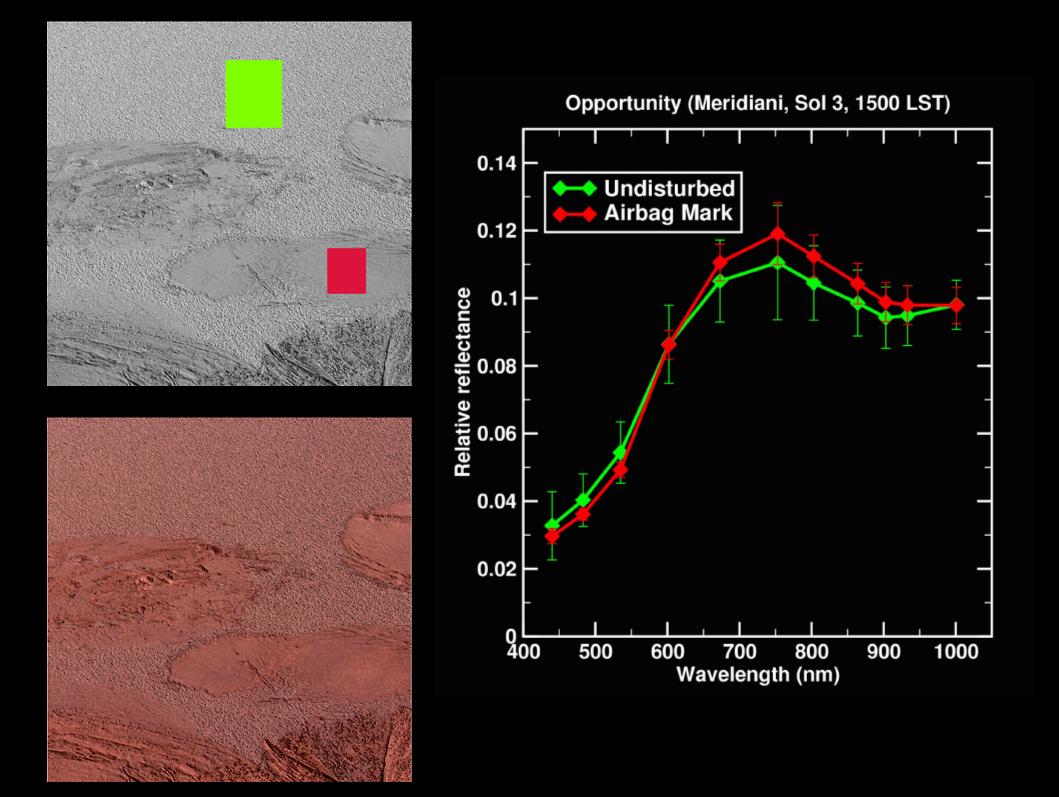 The color image on the lower left from the panoramic camera on the Mars Exploration Rover Opportunity shows the "Lily Pad" bounce-mark area at Meridiani Planum, Mars. This image was acquired on the 3rd sol, or martian day, of Opportunity's mission (Jan.26, 2004). The upper left image is a monochrome (single filter) image from the rover's panoramic camera, showing regions from which spectra were extracted from the "Lily Pad" area. As noted by the line graph on the right, the green spectra is from the undisturbed surface and the red spectra is from the airbag bounce mark.