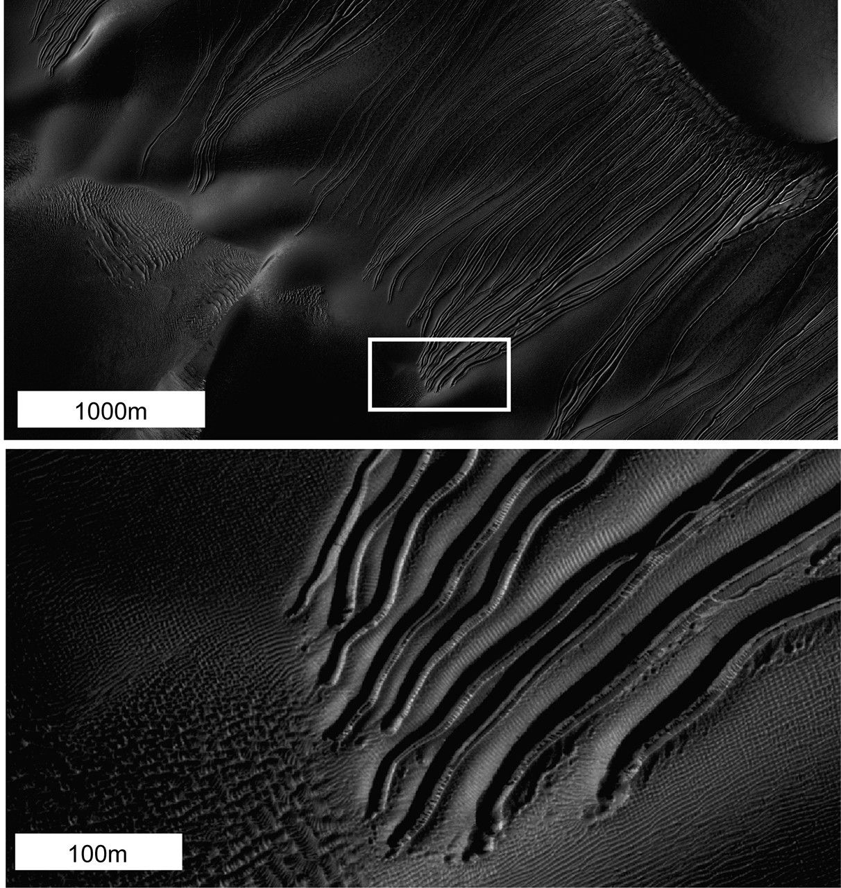 Several types of downhill flow features have been observed on Mars. This image from the High Resolution Imaging Science Experiment (HiRISE) camera on NASA's Mars Reconnaissance Orbiter is an example of a type called "linear gullies." Linear gullies are characterized by relatively constant width and by raised banks or levees along the sides. Unlike gullies caused by water-lubricated flows on Earth and possibly on Mars, they don't have aprons of debris at the downhill end of the channel. The grooves shown here, on the side of a large sand dune inside Russell Crater, are the longest linear gullies known, extending almost 1.2 miles (2 kilometers) down this dune slope.