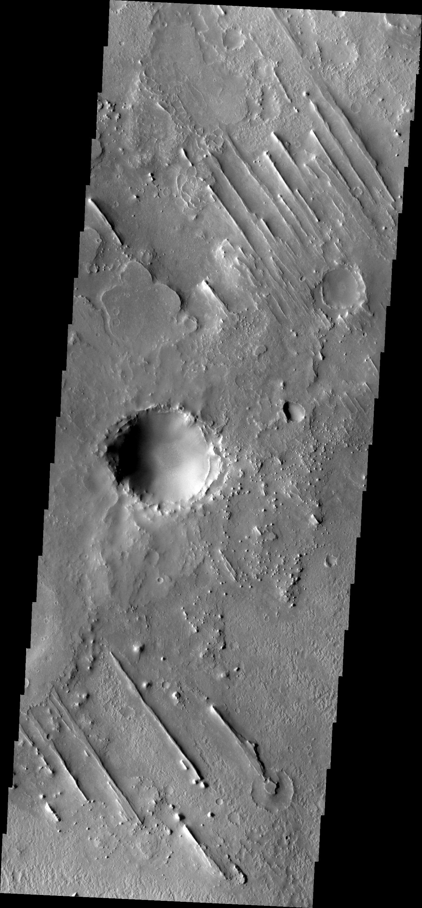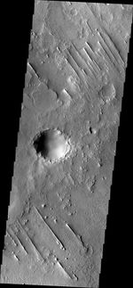 Note: this THEMIS visual image has not been radiometrically nor geometrically calibrated for this preliminary release. An empirical correction has been performed to remove instrumental effects. A linear shift has been applied in the cross-track and down-track direction to approximate spacecraft and planetary motion. Fully calibrated and geometrically projected images will be released through the Planetary Data System in accordance with Project policies at a later time.