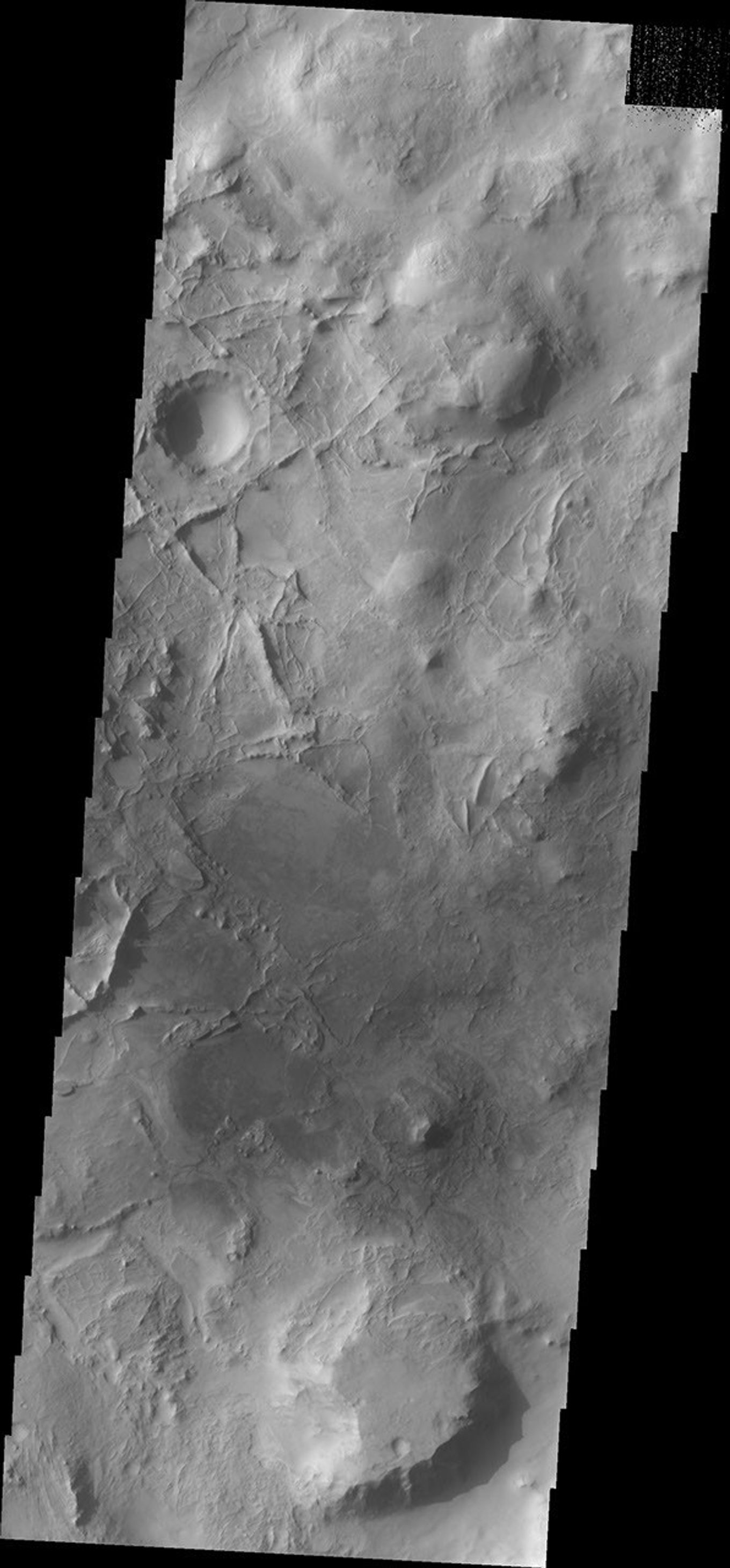 Note: this THEMIS visual image has not been radiometrically nor geometrically calibrated for this preliminary release. An empirical correction has been performed to remove instrumental effects. A linear shift has been applied in the cross-track and down-track direction to approximate spacecraft and planetary motion. Fully calibrated and geometrically projected images will be released through the Planetary Data System in accordance with Project policies at a later time.