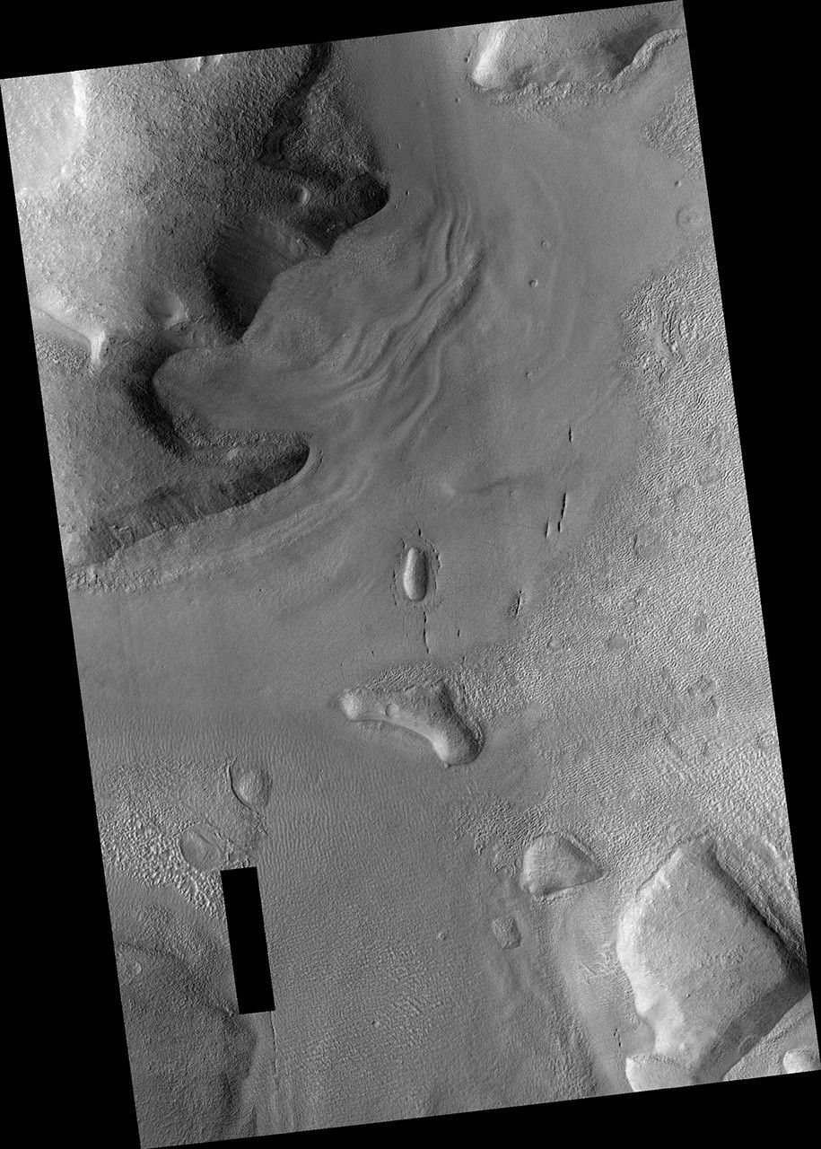 These aprons are composed of nearly pure water ice with a layer of debris on the surface protecting the ice from sublimation (going directly from a solid to gaseous state). This image shows different terrain types on the apron that indicate the presence and flow of ice, from smoother polygonal terrain closer to the massif, to rougher, patterned ground commonly called "brain terrain." Also visible on the apron are a series of linear pits. These pits might form from material collapsing into subsurface voids after buried ice has sublimated.