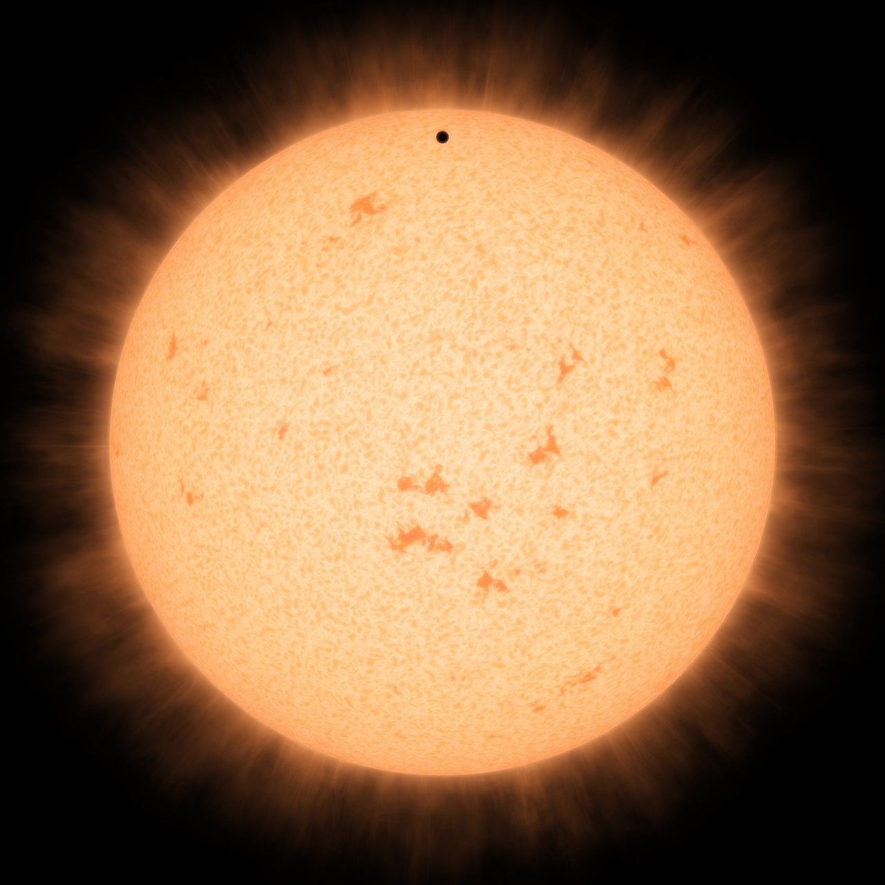 This artist's conception shows the silhouette of a rocky planet, dubbed HD 219134b, as it passes in front of its star. At 21 light-years away, the planet is the closest outside of our solar system that can be seen crossing, or transiting, its star -- a bonus for astronomers because transiting planets make ideal specimens for detailed studies of their atmospheres. It was discovered using the HARPS-North instrument on the Italian 3.6-meter National Galileo Telescope in the Canary Islands, and NASA's Spitzer Space Telescope.