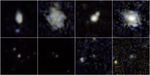 These postage-stamp images were taken by the ultraviolet-sensing telescope -- the top row shows four galaxies that each produced a typical supernova, while the bottom row shows four galaxies that each produced an ultra-bright supernova. All of the galaxies are located at the very center of the images. The top-row galaxies are roughly the size of our Milky Way galaxy.