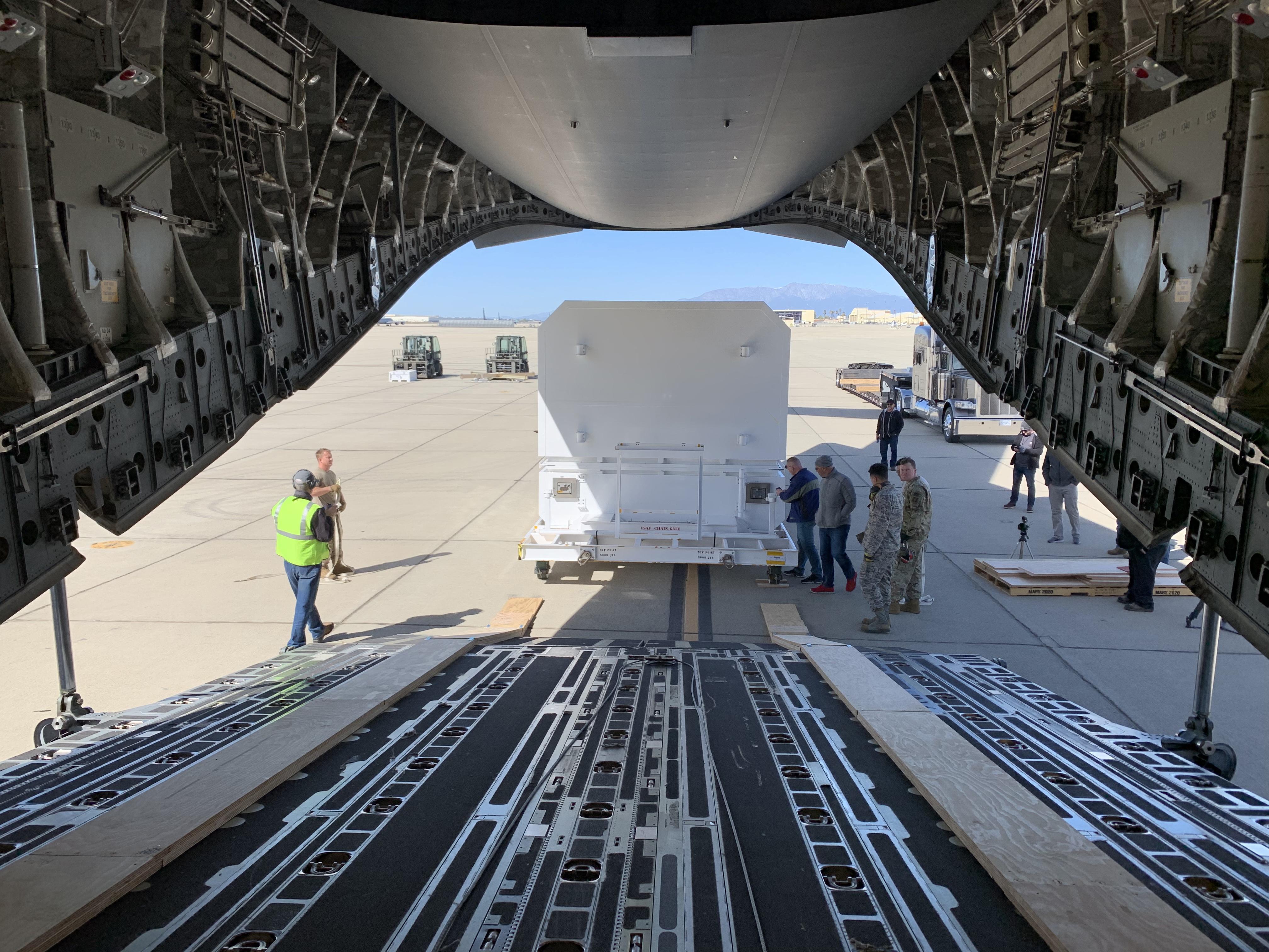 The shipping container carrying NASA's Mars 2020 rover is readied for loading aboard an Air Force C-17 transport plane at March Air Reserve Base in Riverside, California, on Feb. 11, 2020.