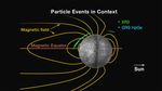 A cross-section of Mercury's magnetosphere (in the noon-midnight plane, i.e., the plane containing the planet-Sun line and Mercury's spin axis) provides context for the energetic electron events observed to date with the MESSENGER XRS and GRS high-purity germanium (HpGe) detectors. The Sun is toward the right; dark yellow lines indicate representative magnetic field lines. Blue and green lines trace the regions along MESSENGER's orbit from April 2 to April 10 during which energetic electrons were detected and MESSENGER's orbit was within ± 5° of the noon-midnight plane. The presence of events on the dayside, their lack in the southern hemisphere, and their frequency of occurrence at middle northern latitudes over all longitudes point to a more complex picture of magnetospheric activity than found at Earth.