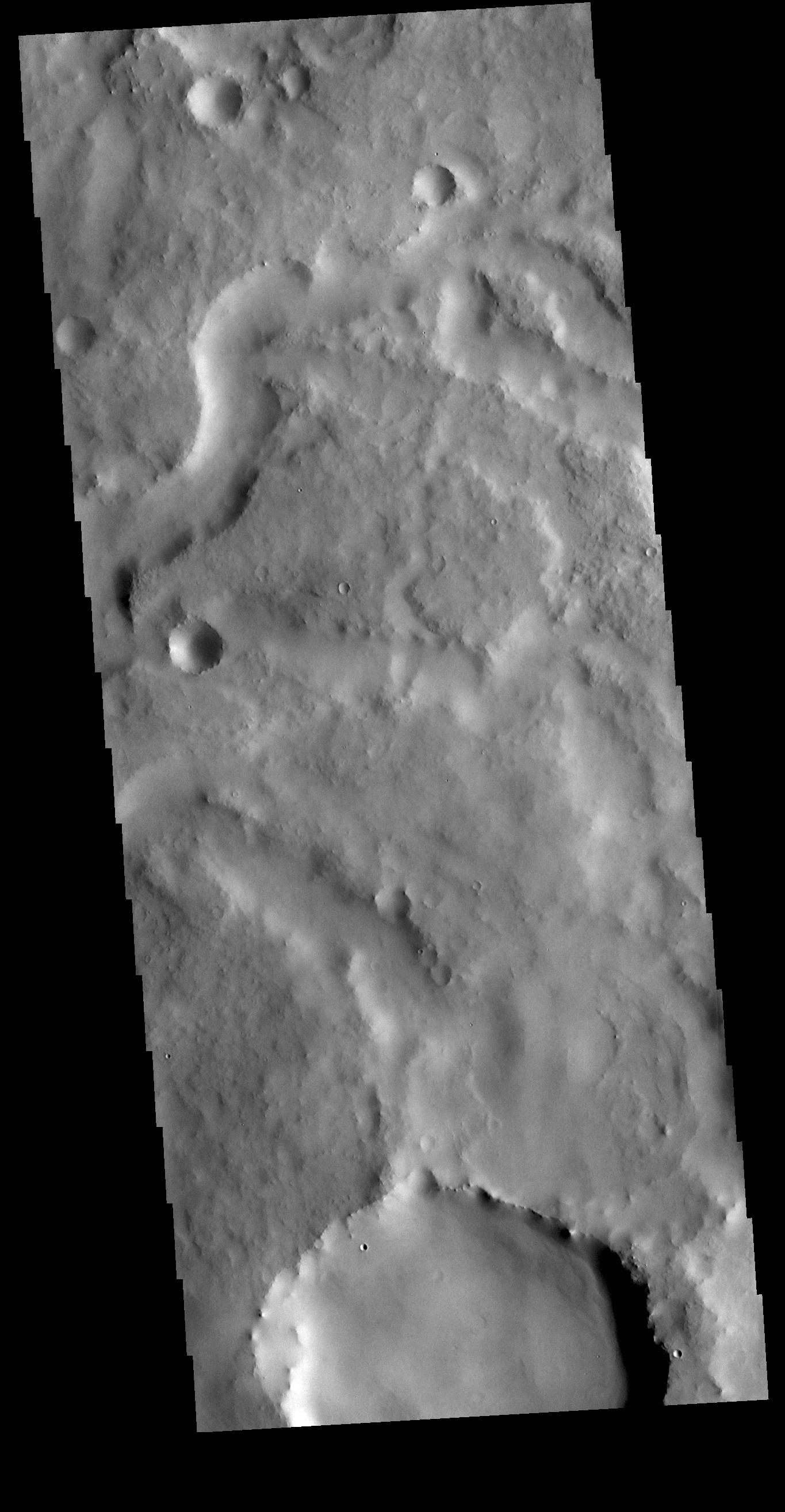Today's VIS shows one of the small channels in Locras Valles. Located in Terra Sabaea, Locras Valles is a group of channels that dissect the plains north of several unnamed craters, the rims of which create the highland where the channels start.