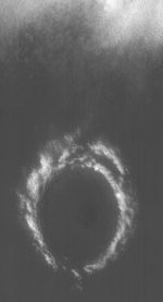 This blue wide angle Mars Global Surveyor (MGS) Mars Orbiter Camera (MOC) image shows the frost-covered rims of Lomonosov Crater in late martian spring. At the north (top) end of the image, low, ground-hugging fog can be seen in association with the retreating seasonal polar cap. Lomonosov Crater is about 150 km (93 mi) in diameter and located at 65°N, 9°W. The image is illuminated by sunlight from the lower left.