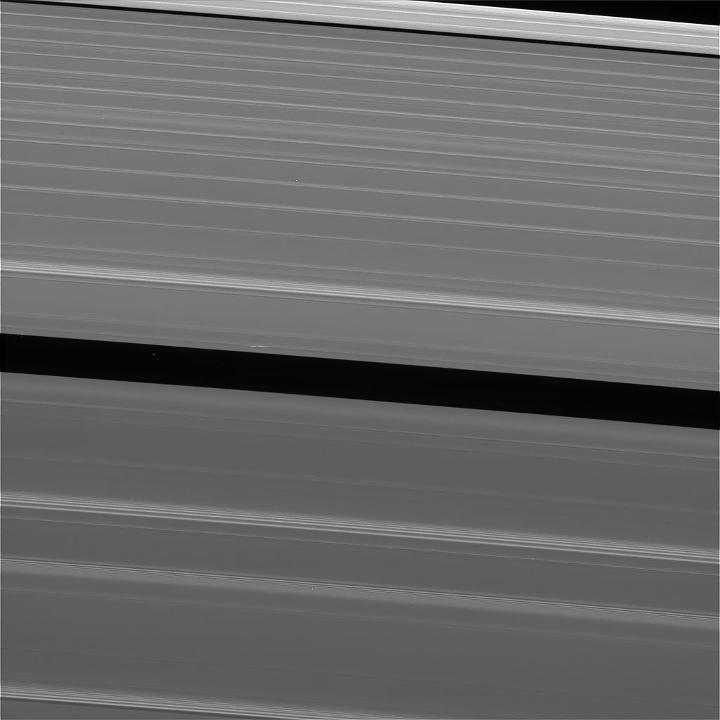This view of Saturn's A ring features a lone "propeller" -- one of many such features created by small moonlets embedded in the rings as they attempt, unsuccessfully, to open gaps in the ring material. The image was taken by NASA's Cassini spacecraft on Sept. 13, 2017. It is among the last images Cassini sent back to Earth.