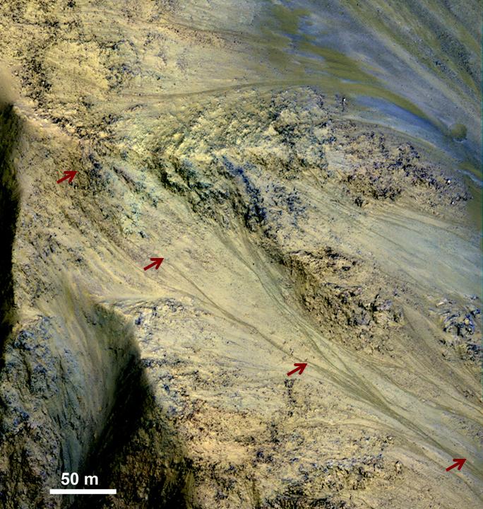 The features, called "recurrent slope linea," may be seasonal flows of salty water. Red arrows indicate the location of one on this image taken by the High Resolution Imaging Science Experiment (HiRISE) camera aboard NASA's Mars Reconnaissance Orbiter. This one is three-quarters of a mile (1.2 kilometers) long.