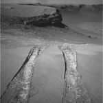The rover laid down the first tracks at this entry and exit point during its 1,291st sol (Sept. 11, 2007), after about a year of exploring around the outside of Victoria Crater for the best access route to the interior. On that sol, Opportunity drove a short distance into the crater and then backed out to check that the footing was good enough to trust this point as an exit route when the work in the crater was finished. Two sols later, Opportunity drove in again for its extended investigation of the rock layers exposed inside the crater.