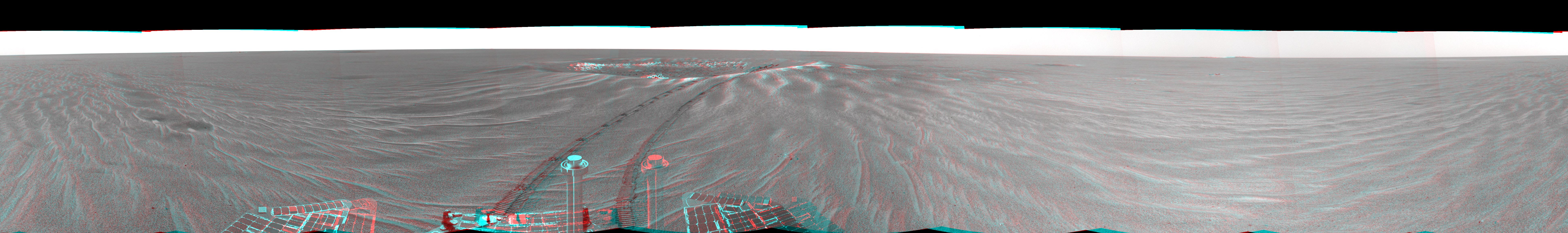 This is a 3-D version of the first 360-degree view from the Mars Exploration Rover Opportunity's new position outside "Eagle Crater," the small crater where the rover landed about two months ago. Scientists are busy analyzing Opportunity's new view of the plains of Meridiani Planum. The plentiful ripples are a clear indication that wind is the primary geologic process currently in effect on the plains. The rover's tracks can be seen leading away from Eagle Crater. At the far left are two depressions--each about a meter (about 3.3 feet) across---that feature bright spots in their centers. One possibility is that the bright material is similar in composition to the rocks in Eagle Crater's outcrop and the surrounding darker material is what's referred to as "lag deposit," or erosional remnants, which are much harder and more difficult to wear away. These twin dimples might be revealing pieces of a larger outcrop that lies beneath. The depression closest to Opportunity is whimsically referred to as "Homeplate" and the one behind it as "First Base." The rover's panoramic camera is set to take detailed images of the depressions today, on Opportunity's 58th sol. The backshell and parachute that helped protect the rover and deliver it safely to the surface of Mars are also visible near the horizon, at the left of the image. This image was taken by the rover's navigation camera.