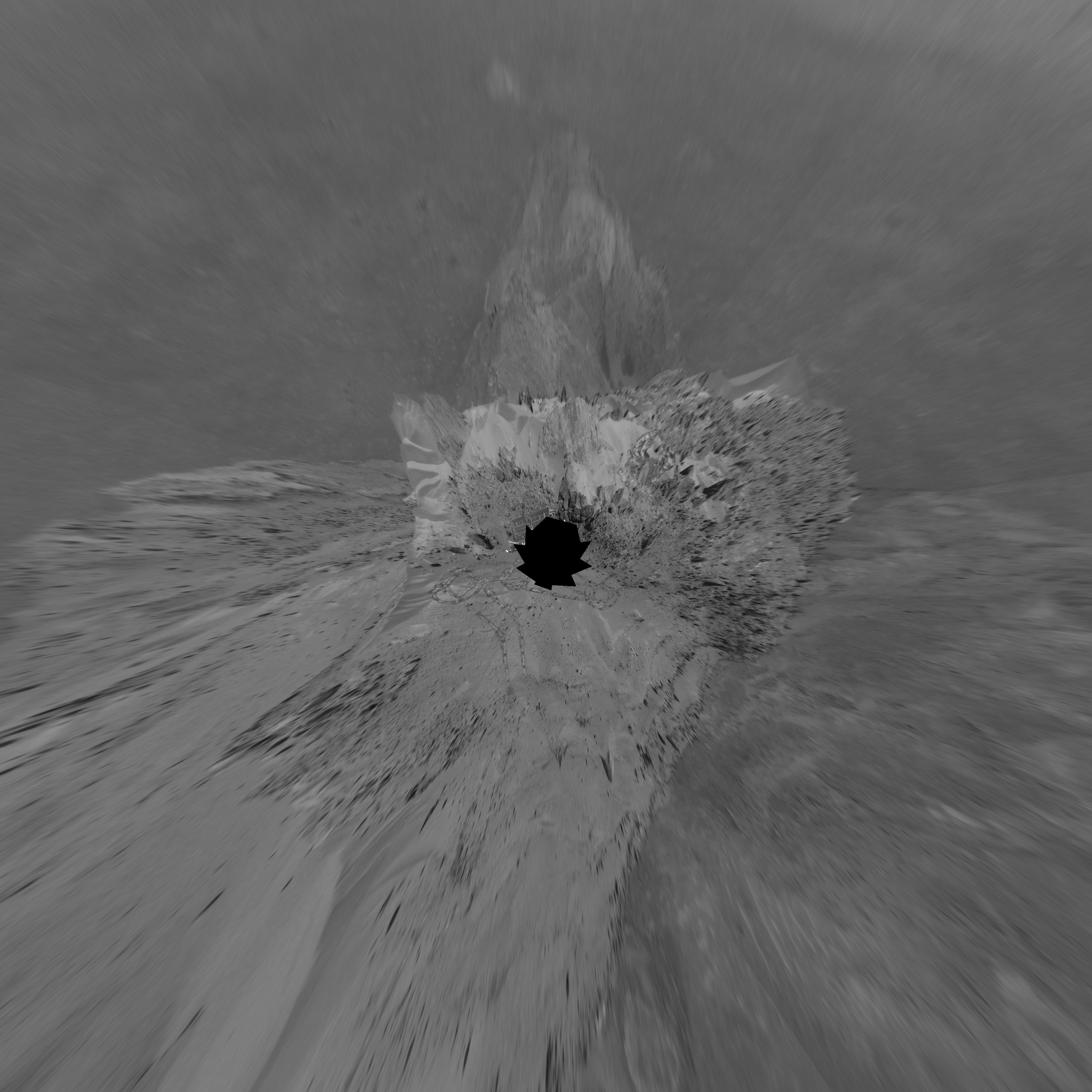 Spirit took this 360-degree panorama of images with its navigation camera on the 627th Martian day, or sol, (Oct. 7, 2005) of its exploration of Gusev Crater on Mars. This view is presented in a polar projection with geometric seam correction.