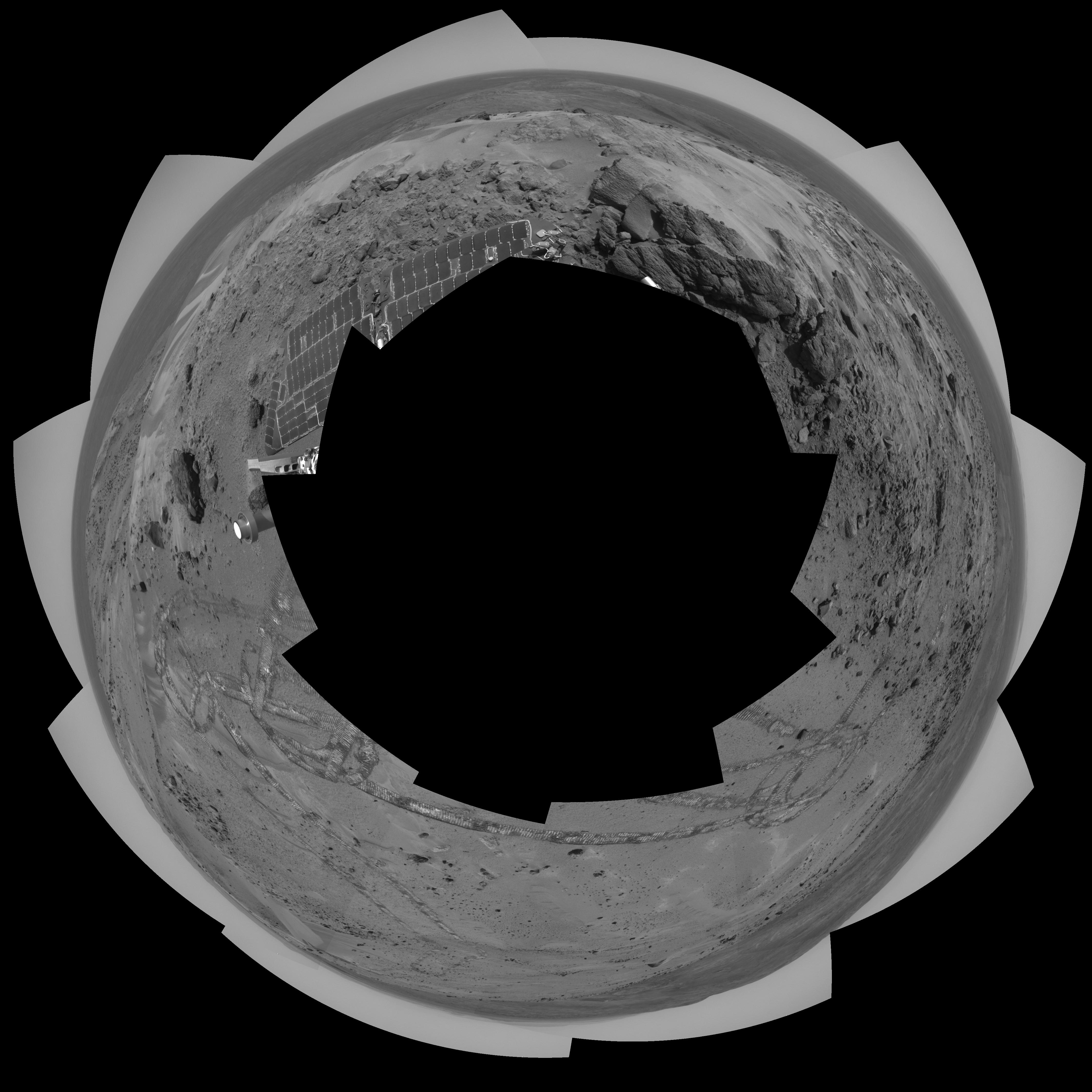 Spirit took this 360-degree panorama of images with its navigation camera on the 627th Martian day, or sol, (Oct. 7, 2005) of its exploration of Gusev Crater on Mars. This view is presented in a vertical projection with geometric seam correction.
