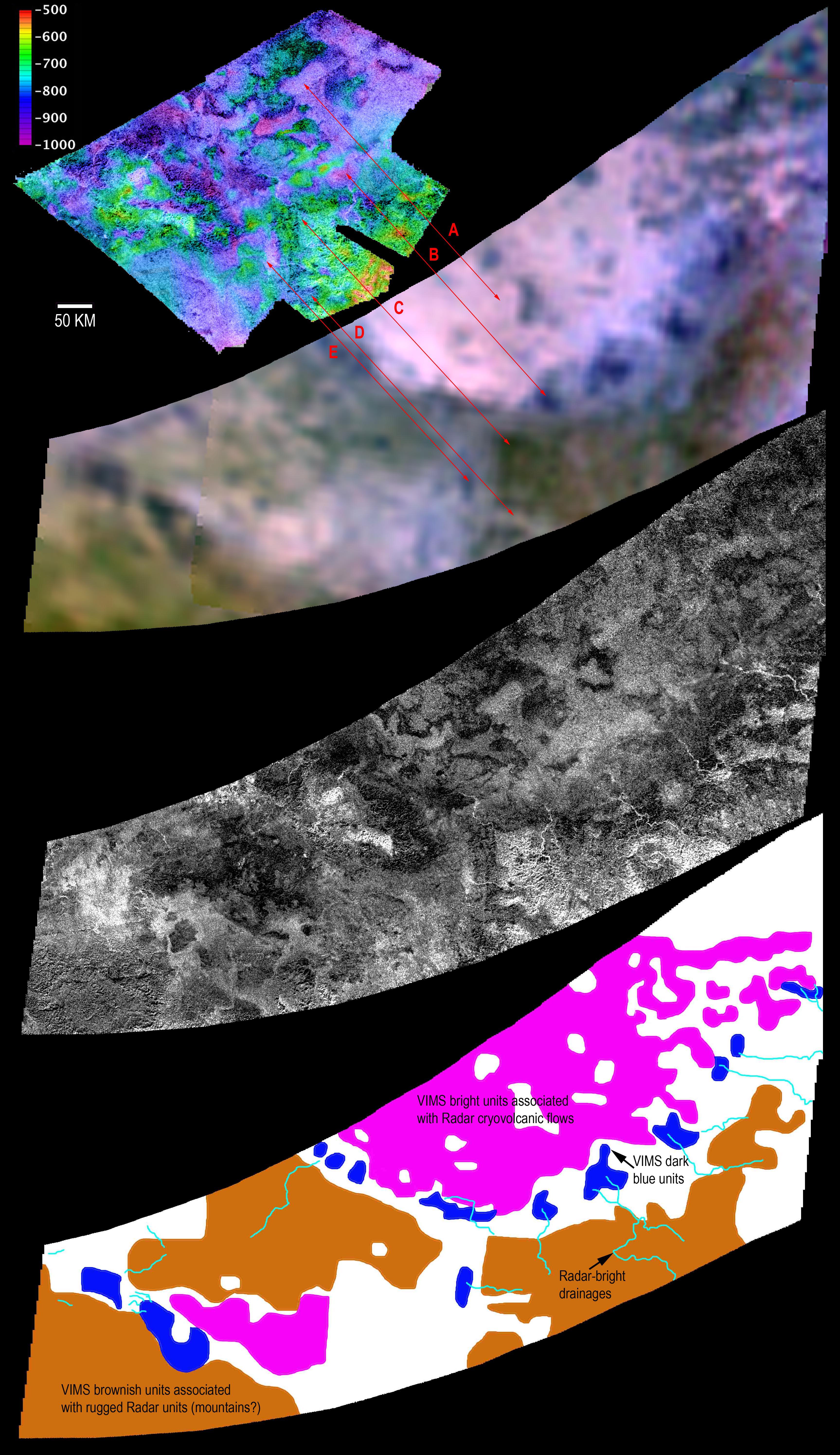 Two different instruments aboard NASA's Cassini spacecraft combined their observations to create a more detailed portrait of the Hotei Regio area on Saturn's moon Titan, which these teams interpret as showing evidence of recent flows from ice volcanoes. The Titan radar mapper sees through Titan's haze to reveal the highs and lows of the terrain in the topography map (top). In the second image down, arrows point to corresponding features seen in the mineral and chemical make-up of the region produced from data provided by Cassini's visual and infrared spectrometer. Titan radar data (third image down) reveal the surface roughness of the area. Data from the two instruments were combined (bottom) to show areas that may have been dominated by past ice volcano flows, along with drainage channels and possible mountainous terrain. The "VIMS dark blue units" are areas thought to be rich in water ice.
