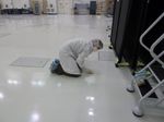 A microbiologist collects a swab sample from the floor of a spacecraft assembly clean room at NASA's Jet Propulsion Laboratory. Samples such as this are taken frequently during the assembly of a spacecraft and analyzed for a census of the types and numbers of microbes present in the clean room.