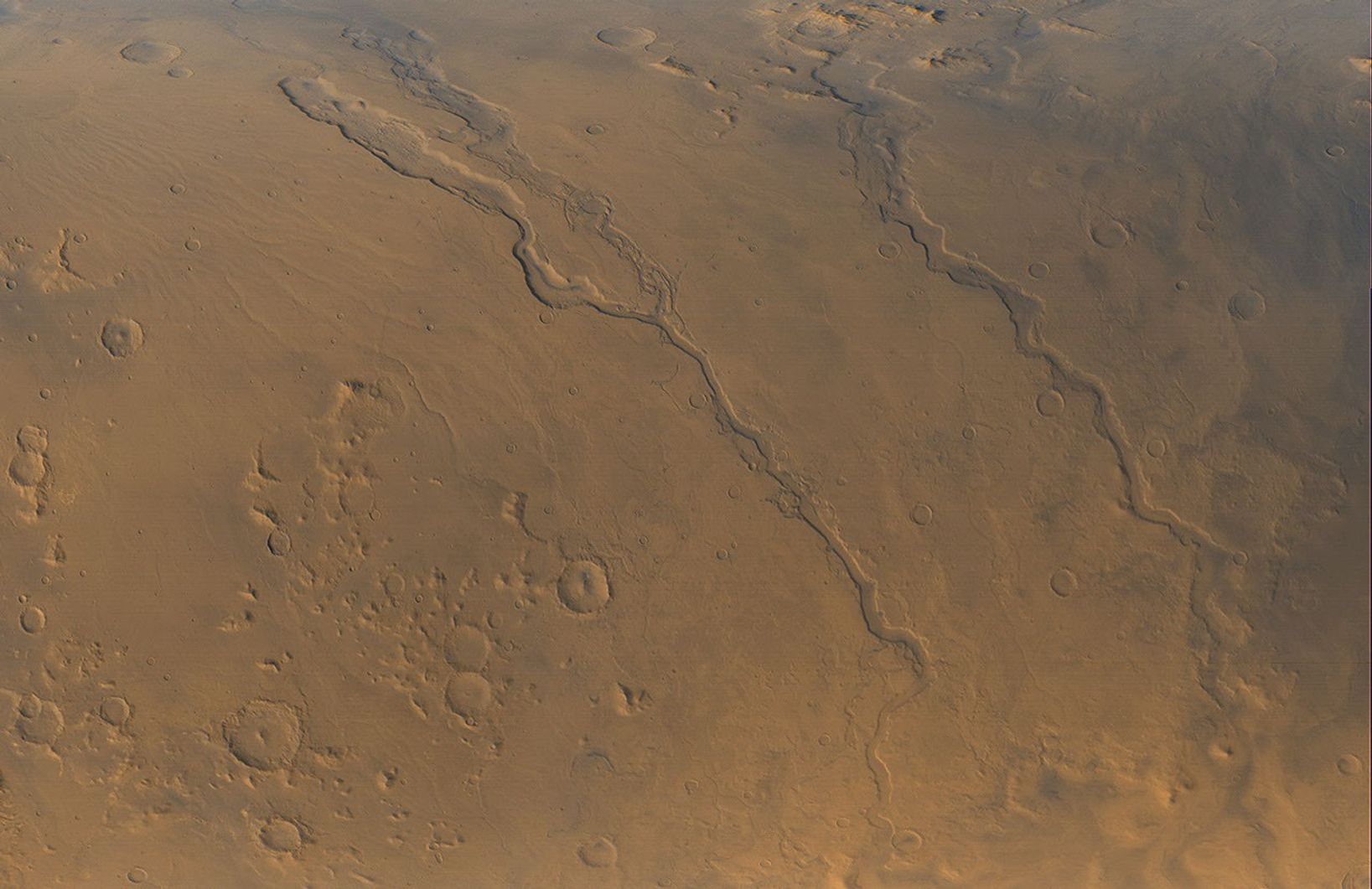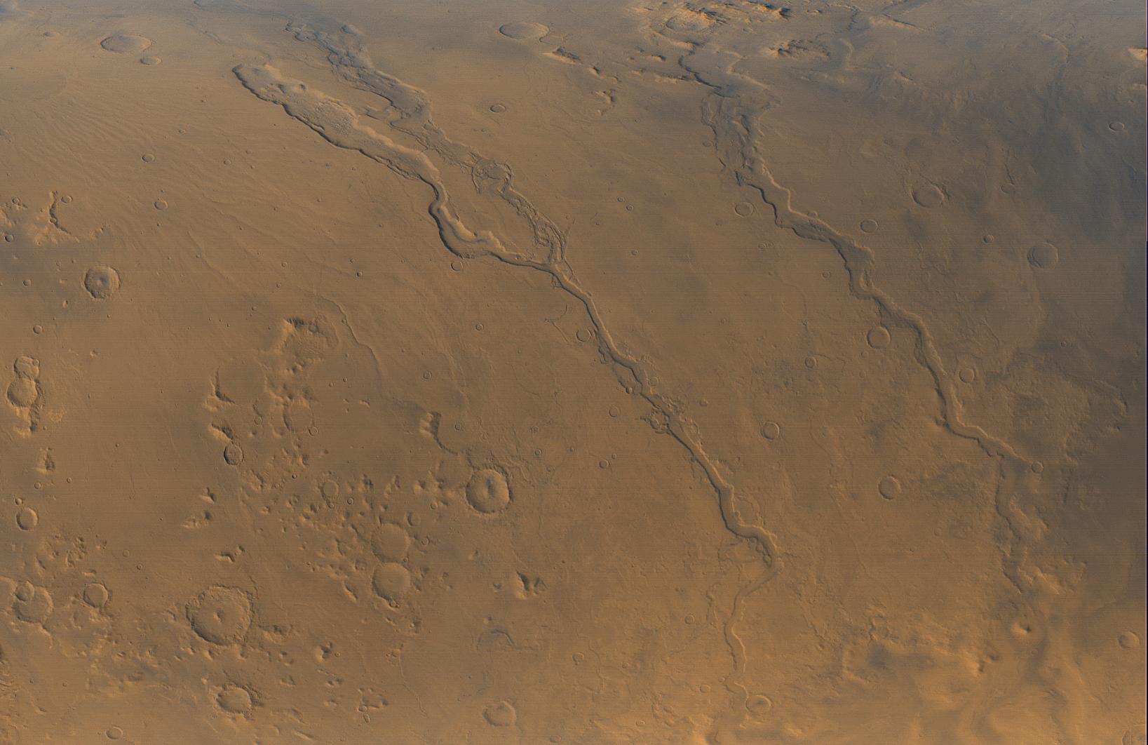 The Mars Global Surveyor (MGS) Mars Orbiter Camera (MOC) opened its fourth year orbiting the red planet with this mid-autumn view of three major valley systems east of the Hellas plains. From left to right, the first major valley, Dao Vallis, runs diagonally from the upper left to just past the lower center of the image. Niger Vallis joins Dao Vallis just above the center of the frame. Harmakhis Vallis extends diagonally across the right half of the picture, toward the lower right. These valleys are believed by some to have been formed--at least in part--by large outbursts of liquid water some time far back in the martian past, though there is no way to know exactly how many hundreds of millions or billions of years ago this might have occurred. In each valley, water would have flowed toward the bottom of the image. Although their dimensions vary along their courses, the valleys are all roughly 1 km (0.6 miles) deep and range in width from about 40 km (25 miles) down to about 8 km (5 mi). Located around 40°S, 270°W, the picture covers an area approximately 800 km across and is illuminated by sunlight from the lower left. North is toward the left; the picture is a composite of red and blue wide angle images obtained by MOC on September 13, 2000.