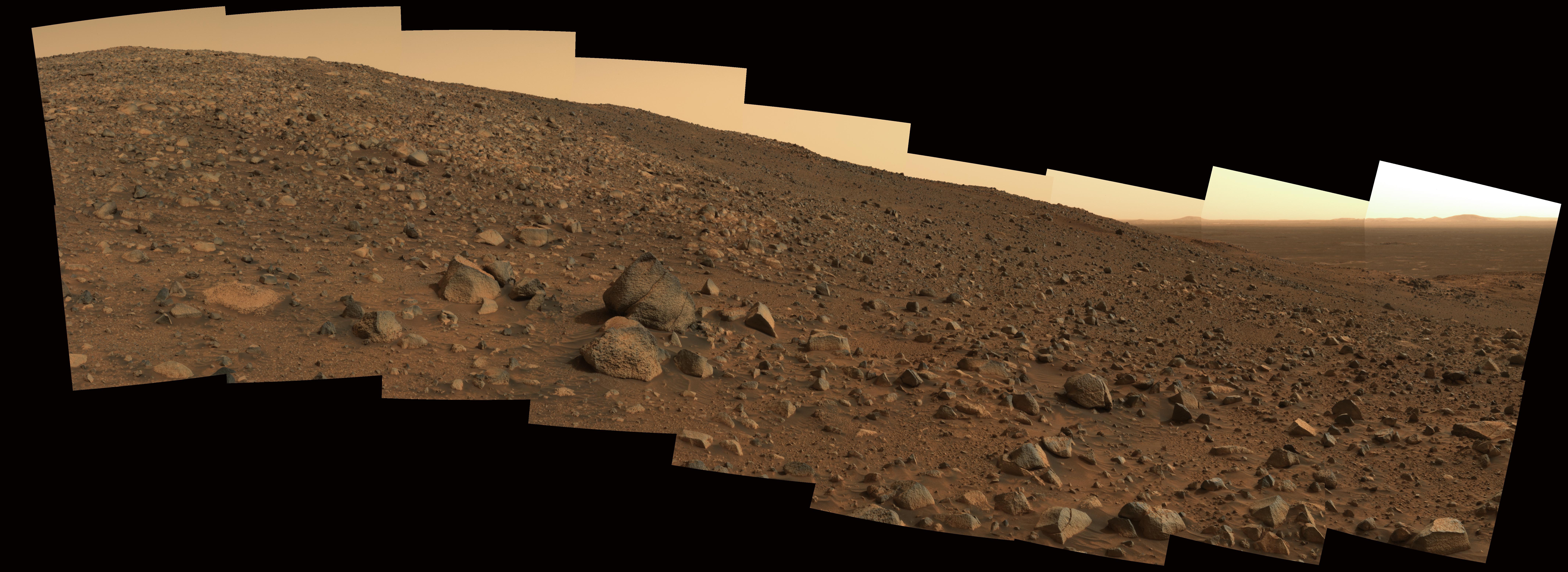 Not long after conducting extensive investigations of tilted martian rock layers along its path, NASA's Spirit rover prepared to resume the trek to the top of the "Columbia Hills" in June. This panorama, nicknamed "Sunset Ridge," shows the terrain that lay ahead of the rover on Spirit's 519th martian day, or sol (June 19, 2005). On the left is the summit of "Husband Hill," Spirit's objective at that time.