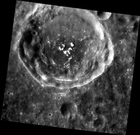 The floor of this unnamed crater, located southeast of Picasso crater, exhibits dark material on the southern crater floor at the base of multiple central peaks. Bright hollows cover the tops of the peaks, resembling a white heart on the dark background.