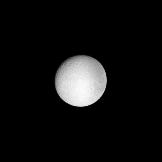 This view looks toward the Saturn-facing side of Rhea at a sun-Rhea-spacecraft, or phase, angle of 15 degrees. To see Rhea at an even lower phase angle -- near opposition -- see PIA10542.