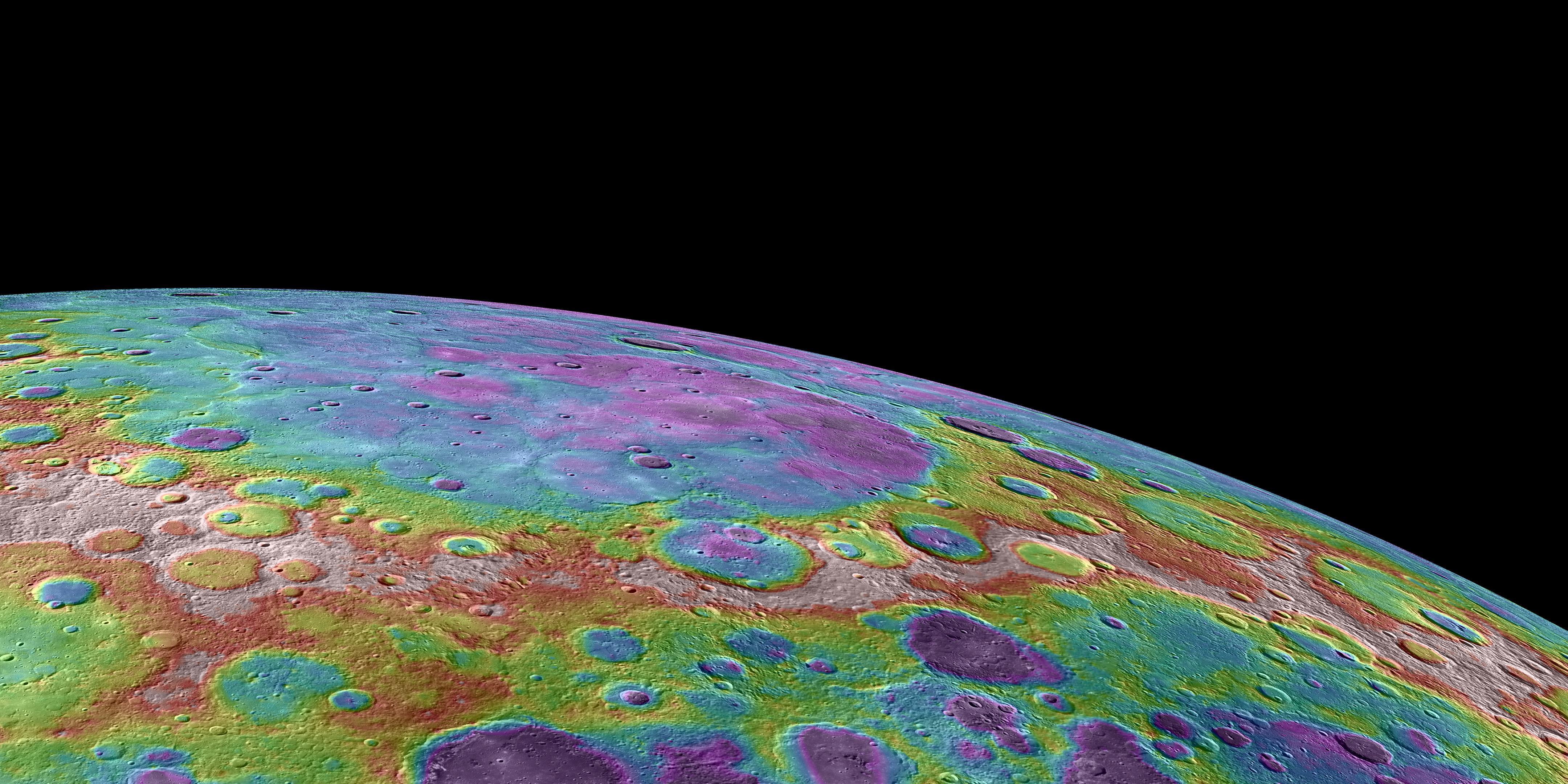 This image shows a perspective view, looking towards Mercury's north and colorized by the topographic height of the surface. The purple colors are the lowest and white is the highest. As shown in this previous release, the total dynamical range of the height variation measured on Mercury is roughly 10 km. The craters Rubens and Monteverdi, with diameters of 159 km and 134 km respectively, are located near the middle of this view. Mercury's expansive northern plains, extending off the upper limb of the planet in this image, have a lower height relative to the neighboring surface.
