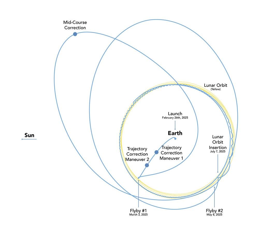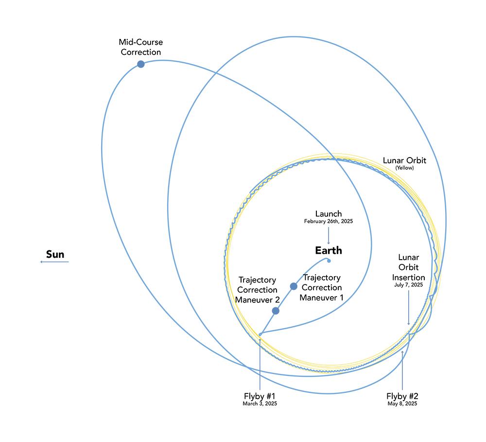 Lunar Trailblazer's voyage to the Moon will take between four and seven months, depending on the day it launches. This orbital diagram shows the low-energy transfer trajectory of the NASA mission should it launch on Feb. 26, the earliest date in a four-day launch period. If it launches that date, the spacecraft is expected to arrive in lunar orbit about four months later. Shown in this diagram are key dates of trajectory correction maneuvers, when the spacecraft will use its thrusters to shape its orbit, and lunar flybys.