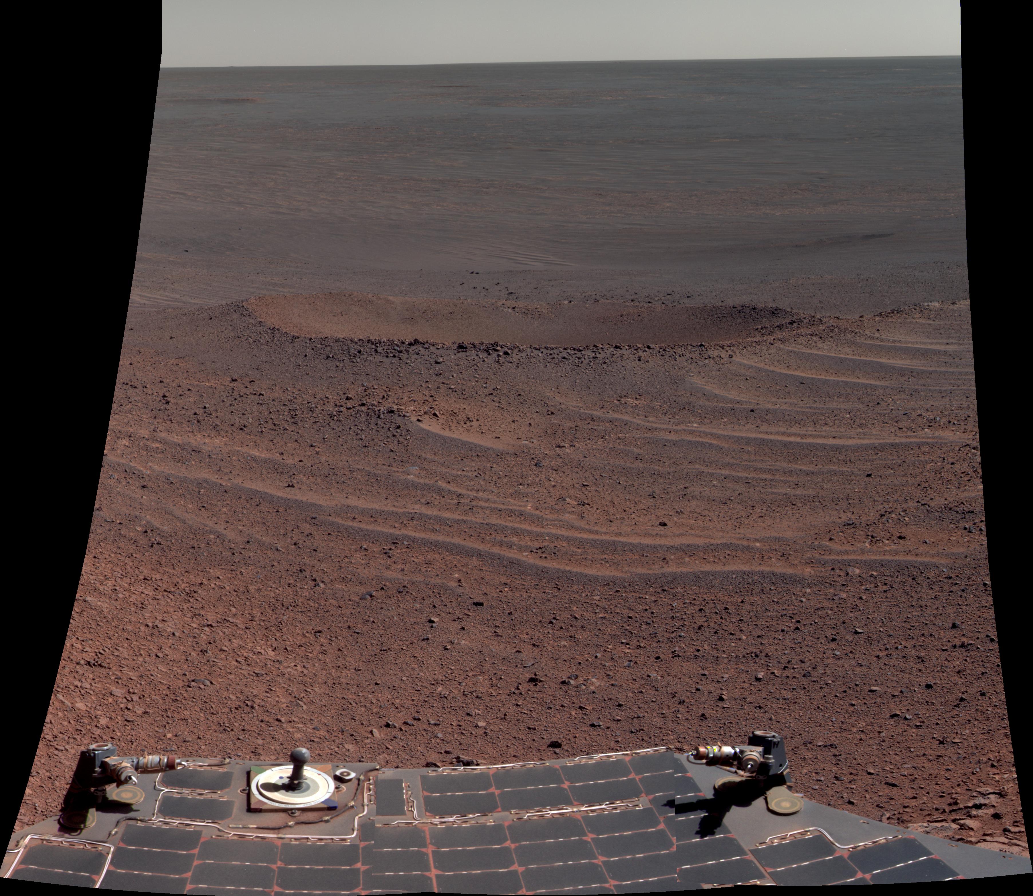 The view merges exposures taken through three of the Pancam's color filters, centered on wavelengths of 601 nanometers (orange), 535 nanometers (green) and 482 nanometers (blue).