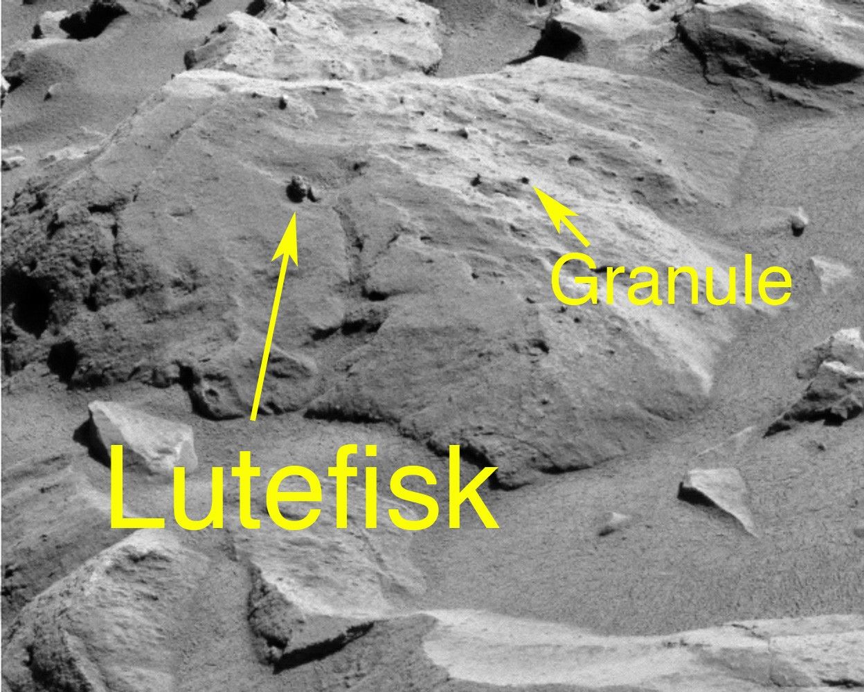 NASA's Mars Exploration Rover Spirit used its panoramic camera to take this image of a rock called "Lutefisk" on the rover's 286th martian day (Oct. 22, 2004). The surface of the rock is studded with rounded granules of apparently more-resistant material up to several millimeters (0.1 inch) or more across. The visible portion of Lutefisk is about 25 centimeters (10 inches) across.