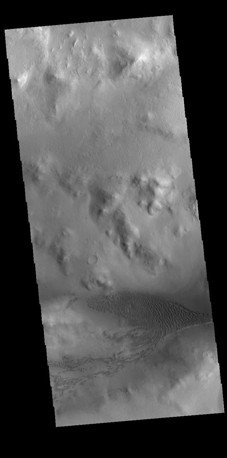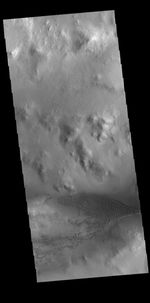 Today's VIS image shows part of the floor of Lyot Crater, including a field of dunes. At 236 km diameter (146 miles), Lyot Crater is one of the largest craters in the northern hemisphere of Mars. Lyot is a double ringed crater, and these dunes are located in the outer of the two rings.