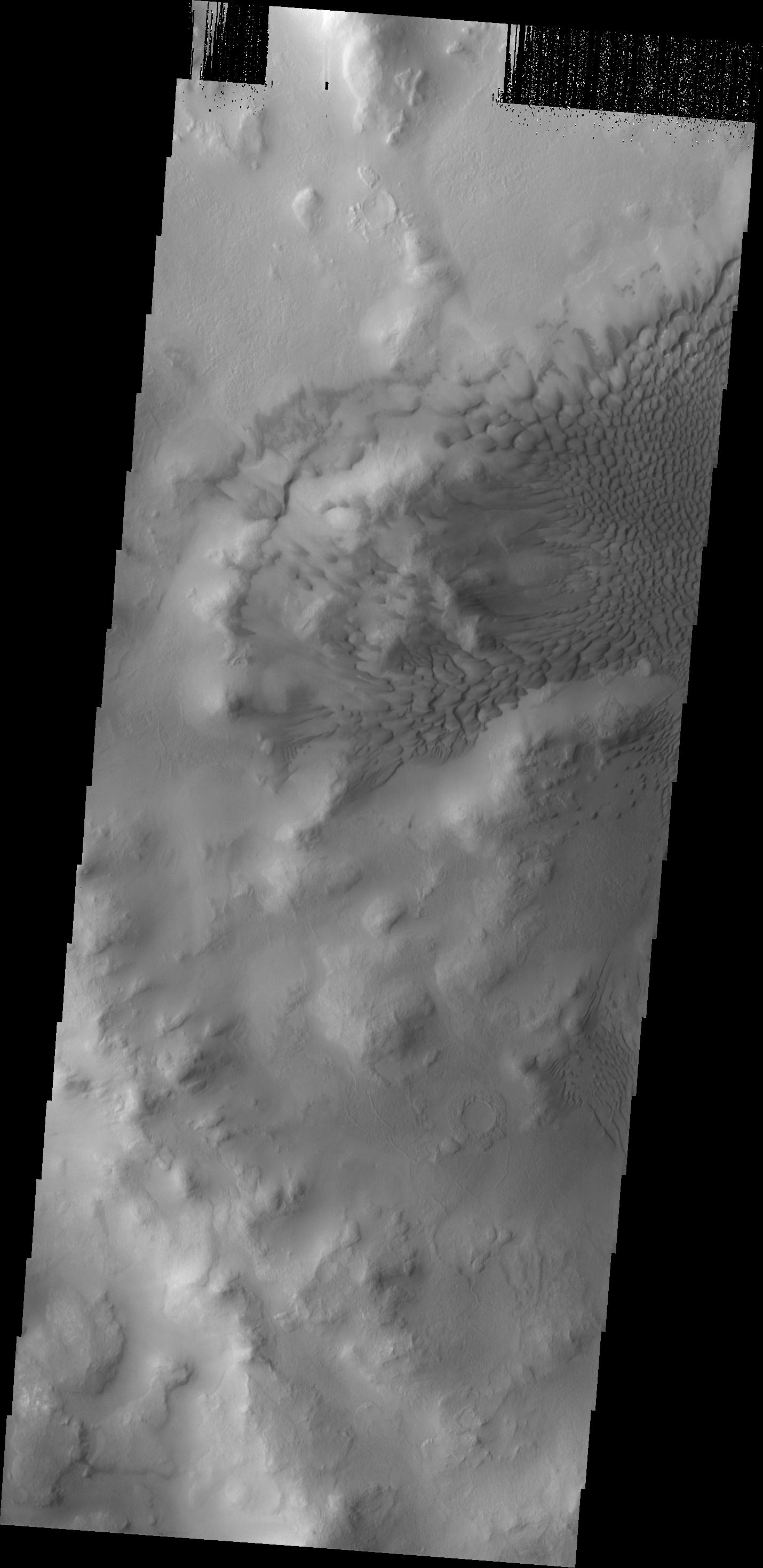 Note: this THEMIS visual image has not been radiometrically nor geometrically calibrated for this preliminary release. An empirical correction has been performed to remove instrumental effects. A linear shift has been applied in the cross-track and down-track direction to approximate spacecraft and planetary motion. Fully calibrated and geometrically projected images will be released through the Planetary Data System in accordance with Project policies at a later time.