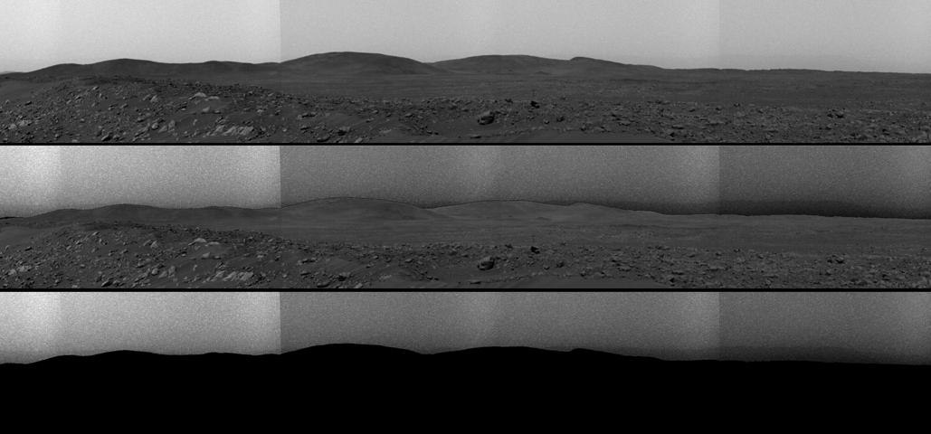 This top image is a panorama mosaic taken by the Mars Exploration Rover Spirit panoramic camera on sol 68 of the rover's mission (March 12, 2004). The southern end of the hills nicknamed the "Columbia Hills" can be seen on the left near the horizon. The middle image shows the same view, but the sky has been further processed to show contrast, bringing out a feature that dips along the rim of Gusev Crater. The feature, toward the right of the image, is a valley called Ma'adim Vallis that appears to go through the crater. In the bottom version of the image, the foreground is masked for better viewing of the Gusev Crater rim, which at its closest point is approximately 50 miles (80 kilometers) away from Spirit.