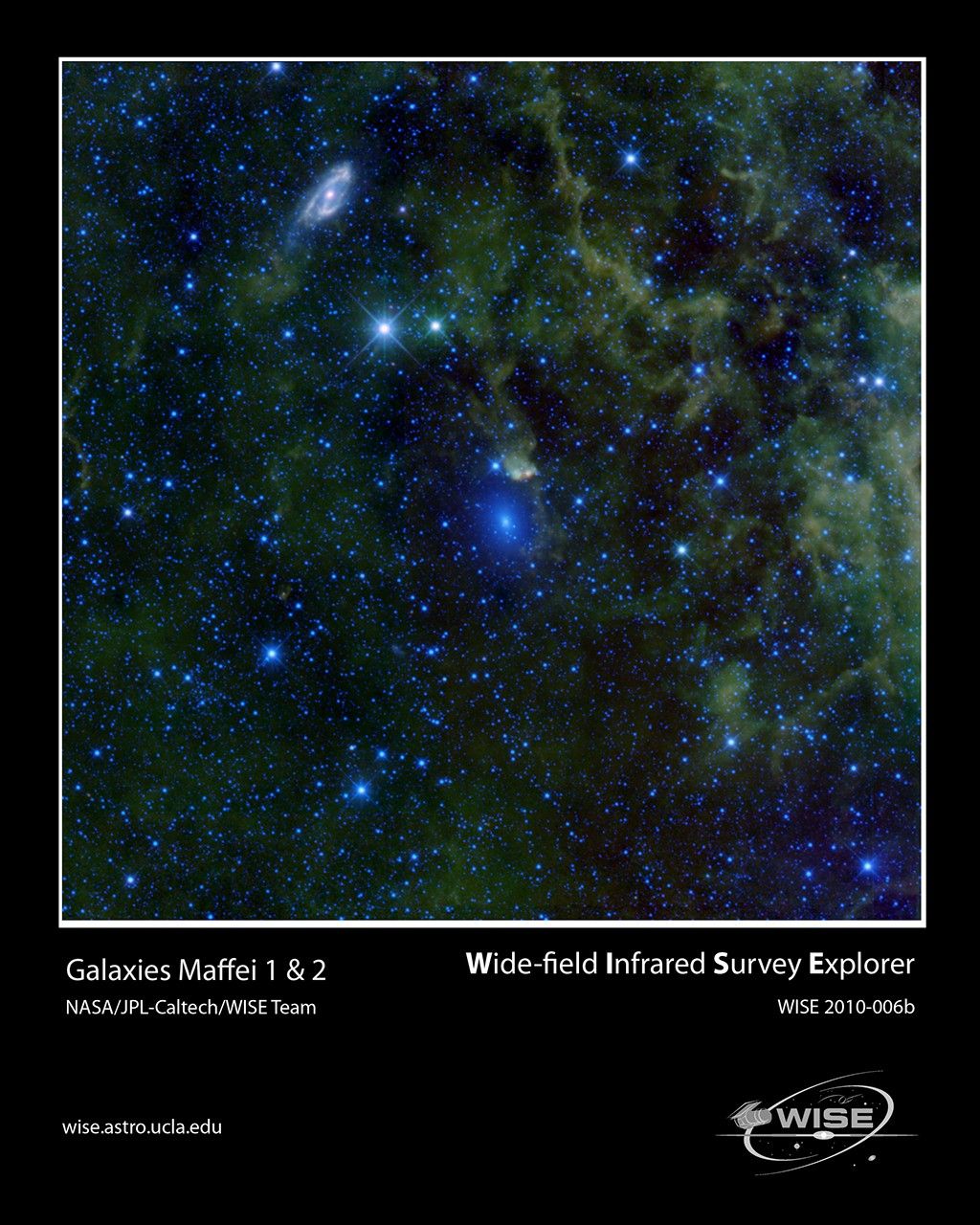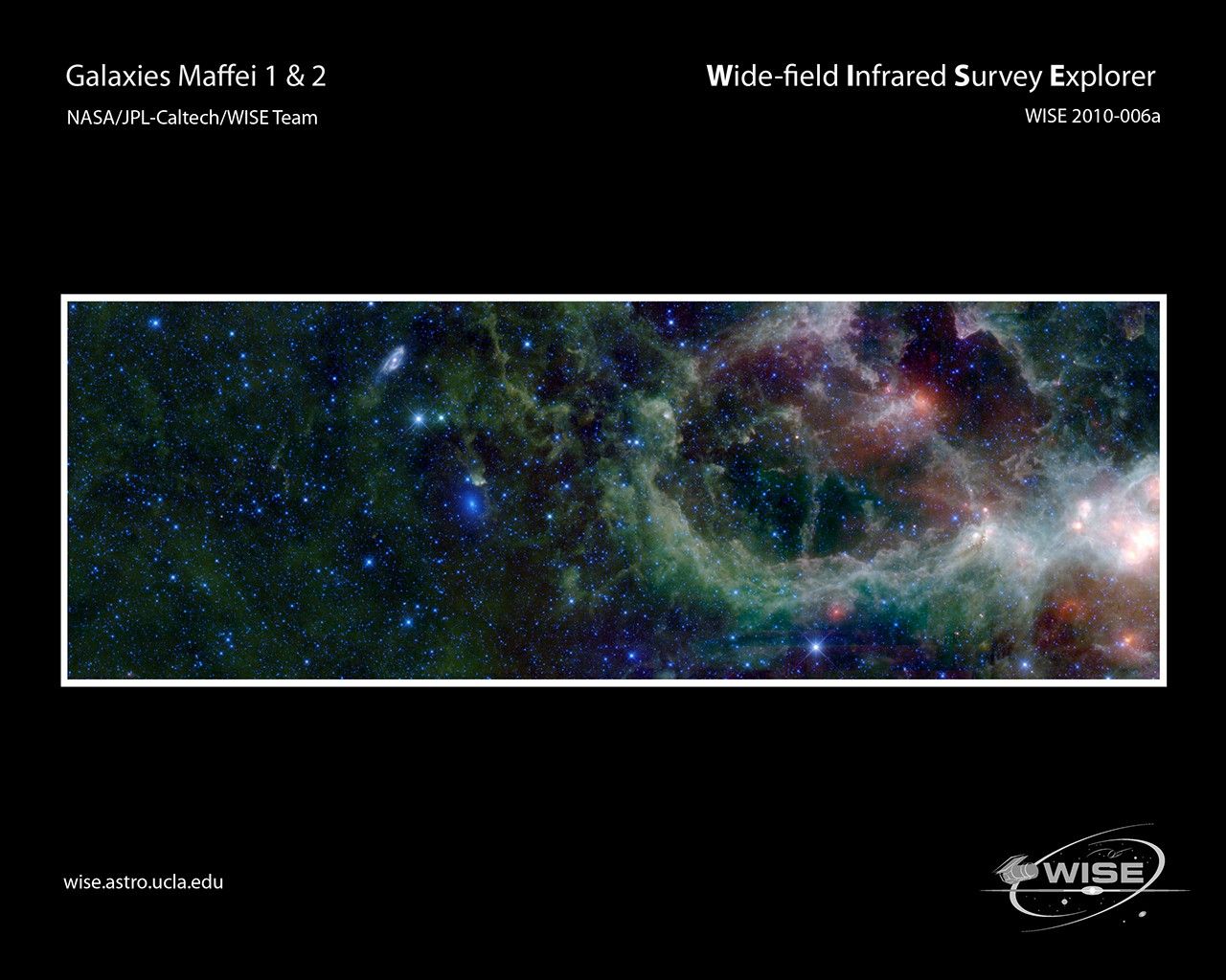 A mosaic of images from WISE in the constellation of Cassiopeia. This region contains a large star forming nebula within the Milky Way Galaxy, called IC 1805 (sometimes called the Heart Nebula), a portion of which is seen at the right of the image. IC 1805 is over 6 thousand light-years from Earth. Also visible in this image are two nearby galaxies, Maffei 1 and Maffei 2. In visible light these galaxies are hidden by dust in IC 1805 and were unknown until 1968 when Paolo Maffei found them using infrared observations. Both galaxies contain billions of stars and are located some 10 million light-years away (well outside our own Milky Way Galaxy). Maffei 1 is the bluish elliptical object in the center of the image. It is a Lenticular type galaxy, which has a disk-like structure and a central bulge but no spiral structure or appreciable dust content. Maffei 2 (to the upper left of Maffei 1) is a Spiral type galaxy that also has a disk shape, but with a bar-like central bulge and two prominent dusty spiral arms.