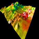 This perspective view of Venus, generated by computer from Magellan data and color-coded with emissivity, shows part of the lowlands to the north of Ovda Regio. The prominent topographic feature is a shield volcano, one of many distinct types of volcanic features on Venus. The volcano, with its partially breached summit caldera and central dome, bears a superficial resemblance to Mount St. Helens in this strongly vertically exaggerated view. In reality, it is roughly 700 km across, comparable to Olympus Mons on Mars, although it is only 2 km high. The extremely low, broad shape of the volcano probably results from the eruption of highly fluid lava such as basalt, combined with Venus' high surface temperature. Individual lava flows can be seen on the righthand side of the volcano, which has a slope of less than half a degree. The rugged area at the extreme right is part of a fracture zone that appears to extend under the volcano and may have provided a path by which lava was erupted. The cone-shaped hill in the foreground is an artifact caused by a single erroneous altimeter measurement; its size gives an indication of the horizontal resolution of the altimetry map. Magellan MIDR quadrangle* containing this image: C1-15N077. Image resolution (m): 225. Size of region shown (E-W x N-S, in km): 851 x 878. Range of emissivities from violet to red: 0.74 -- 0.84. Vertical exaggeration: 100. Azimuth of viewpoint (deg clockwise from East): 135. Elevation of viewpoint (km): 300. *Quadrangle name indicates approximate center latitude (N=north, S=south) and center longitude (East).