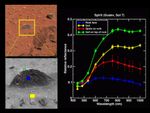 The upper left image in this display is from the panoramic camera on the Mars Exploration Rover Spirit, showing the "Magic Carpet" region near the rover at Gusev Crater, Mars, on Sol 7, the seventh martian day of its journey (Jan. 10, 2004). The lower image, also from the panoramic camera, is a monochrome (single filter) image of a rock in the "Magic Carpet" area. Note that colored portions of the rock correlate with extracted spectra shown in the plot to the side. Four different types of materials are shown: the rock itself, the soil in front of the rock, some brighter soil on top of the rock, and some dust that has collected in small recesses on the rock face ("spots"). Each color on the spectra matches a line on the graph, showing how the panoramic camera's different colored filters are used to broadly assess the varying mineral compositions of martian rocks and soils.