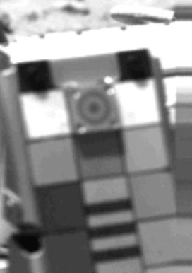 The dark bullseye pattern seen at the top of Viking l's camera calibration chart indicates the presence of magnetic particles in the fine dust in the Martian atmosphere. A tiny magnet is mounted at that spot to catch wind-borne magnetic particles. The particles may have been tossed into the atmosphere surrounding the spacecraft at the time of landing and during the digging and delivery of the Mars soil sample by the surface sampler scoop. This picture was taken August 4.