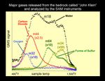 Curiosity's Sample Analysis at Mars (SAM) instrument suite conducted the analysis. The first step in the analysis of a portion of this drilled sample was to heat the sample in a quartz oven to 1,535 degrees Farenheit (835 degrees Celsius) and analyze the gases as they were released using SAM's quadrupole mass spectrometer (QMS). The signatures of more than five hundred mass values were sampled during the heating of this drilled sample and analyzed by the QMS. Five are shown in the graph. These traces are diagnostic of water, carbon dioxide, oxygen, and two forms of sulfur (sulfur dioxide, the oxidized form, and hydrogen sulfide, the reduced form) measured by the QMS.