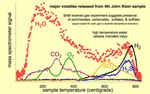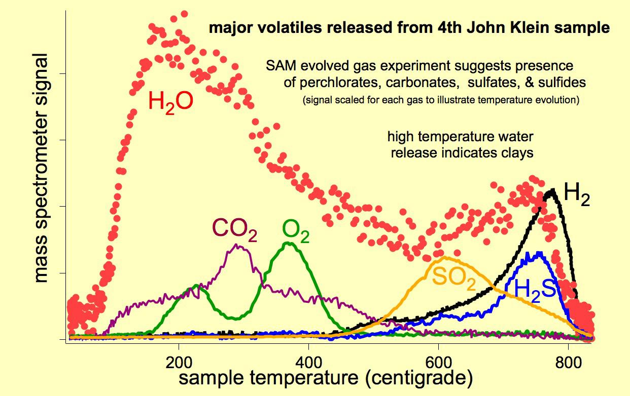 The mass spectrometer signal is scaled separately for each gas so that the same graph can illustrate the patterns for various gases showing what temperatures caused the gas to be released. These evolved gases and the temperatures at which they evolved suggest the presence of hydrated minerals, carbonates, perchlorates, sulfates and sulfides, and clays in the rock-powder sample.