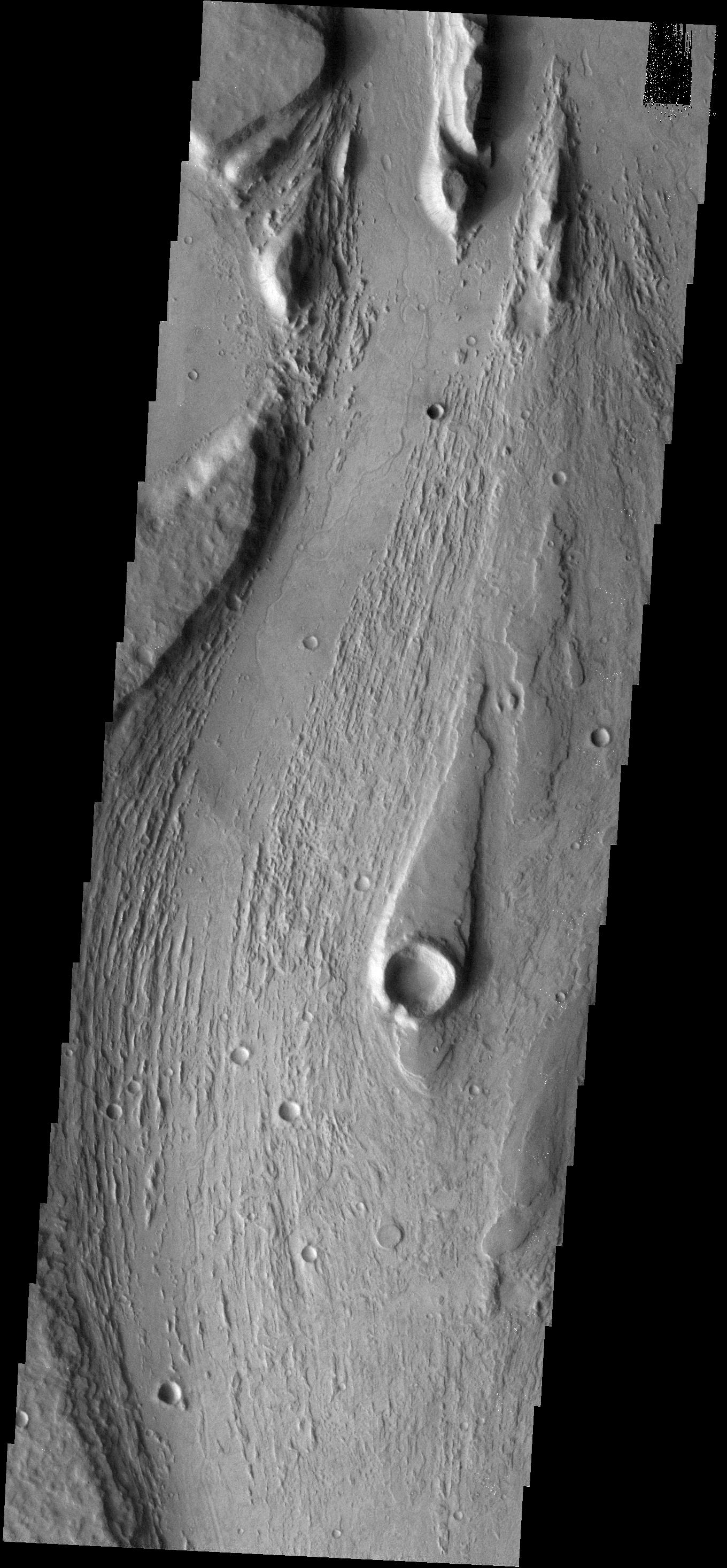 This image shows part of Managala Vallis, including a streamlined island. The narrow tail of the island points downstream.