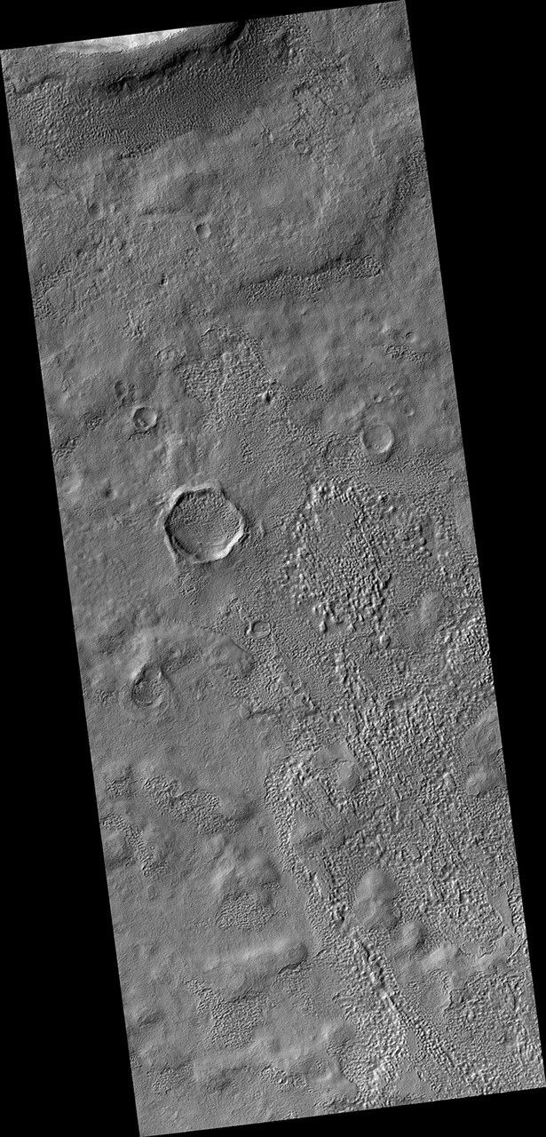 This HiRISE image shows terrain typical of these mantling deposits in the Southern Hemisphere, east of Reull Vallis. The pitted texture suggests that ice is sublimating out from the deposits as the region is warmed under current lower obliquity conditions.