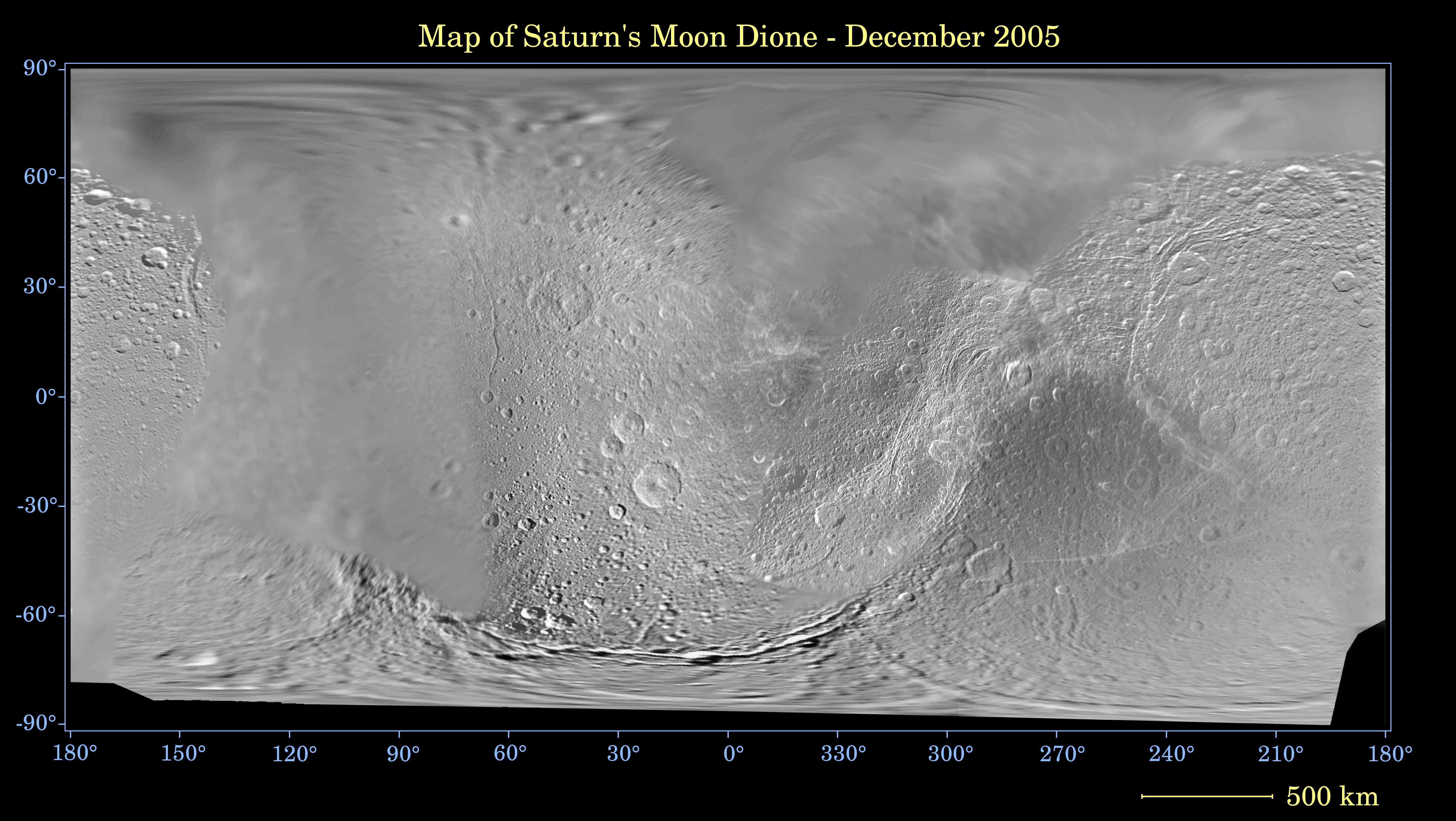 This global digital map of Saturn's moon Dione was created using data taken during Cassini and Voyager spacecraft flybys. The map is an equidistant projection and has a scale of 977 meters (3,205 feet) per pixel.