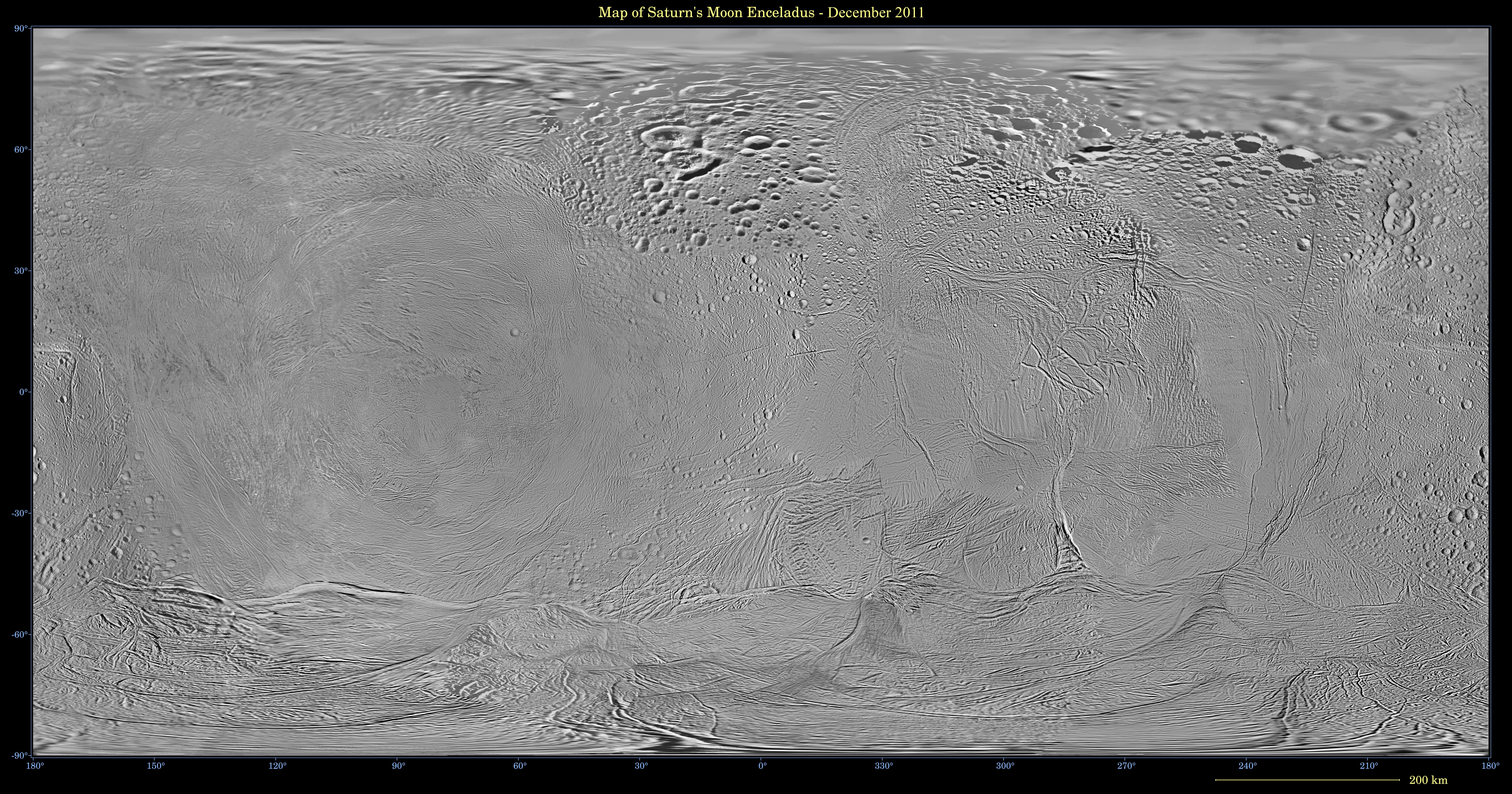 The map is an equidistant (simple cylindrical) projection and has a scale of 360 feet (110 meters) per pixel at the equator. The mean radius of Enceladus used for projection of this map is 157 miles (252 kilometers).
