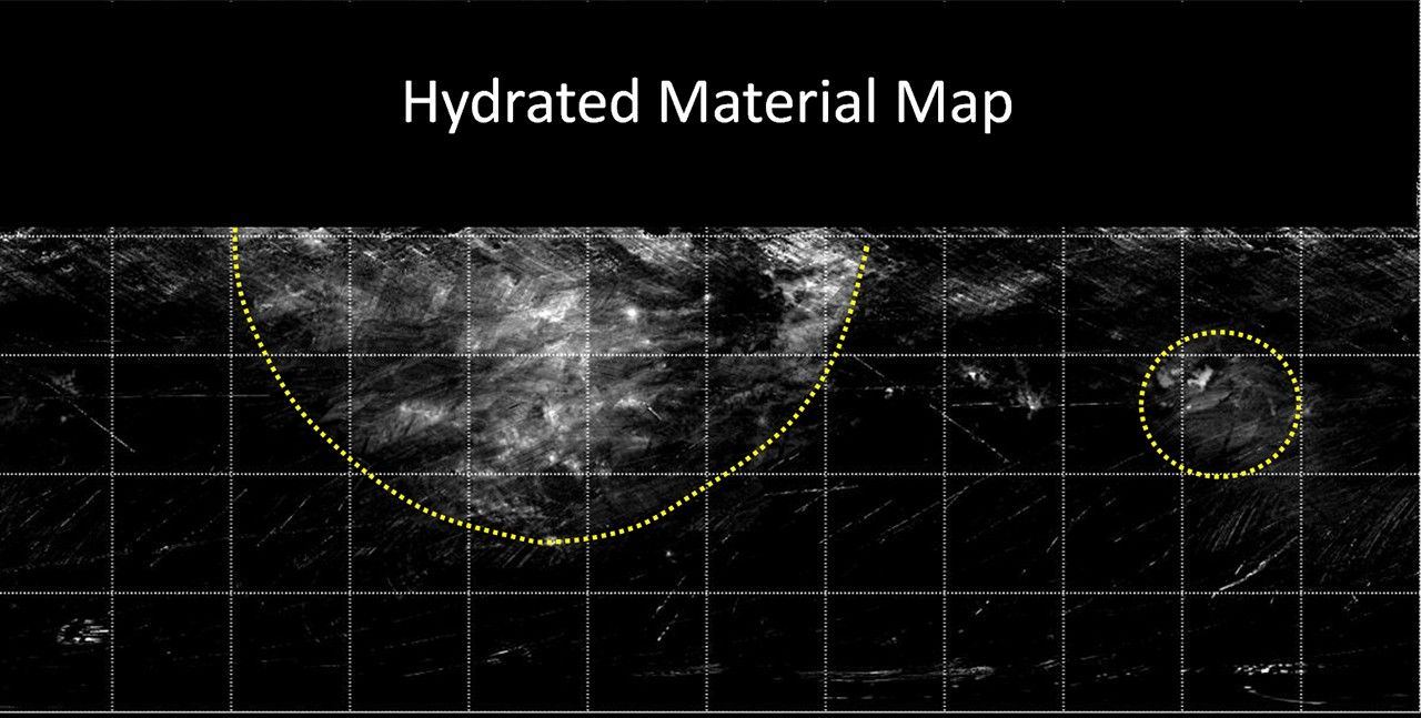 This map from NASA's Dawn mission indicates the presence of hydrated minerals on the giant asteroid Vesta. Hydrated minerals are seen in white, with areas of high concentrations circled with a yellow dotted line in the annotated version. The data were obtained by Dawn's visible and infrared mapping spectrometer in August 2011, from an altitude of 1,700 miles (2,700 kilometers).